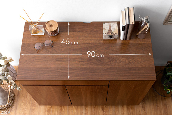 約幅90×45cmの広々とした天板スペース。お気に入りの雑貨や植物をディスプレイしてリビングのインテリアとしてお楽しみいただけます。