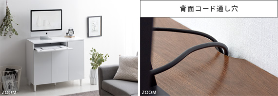 背面側にはコードを通せるカットが入っているので、デスクトップを置いても、コードを収納してすっきりした見栄えのお部屋をお作りいただけます。