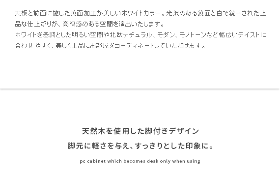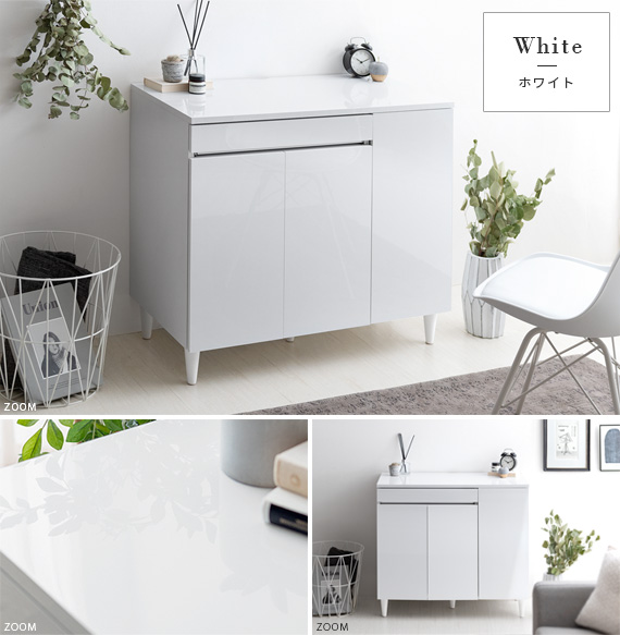 天板と前面に施した鏡面加工が美しいホワイトカラー。光沢のある鏡面と白で統一された上品な仕上がりが、高級感のある空間を演出いたします。