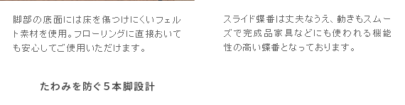 脚部の底面には床を傷つけにくいフェルト素材を使用。フローリングに直接おいても安心してご使用いただけます。