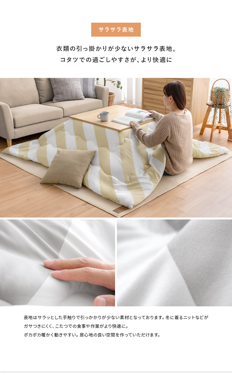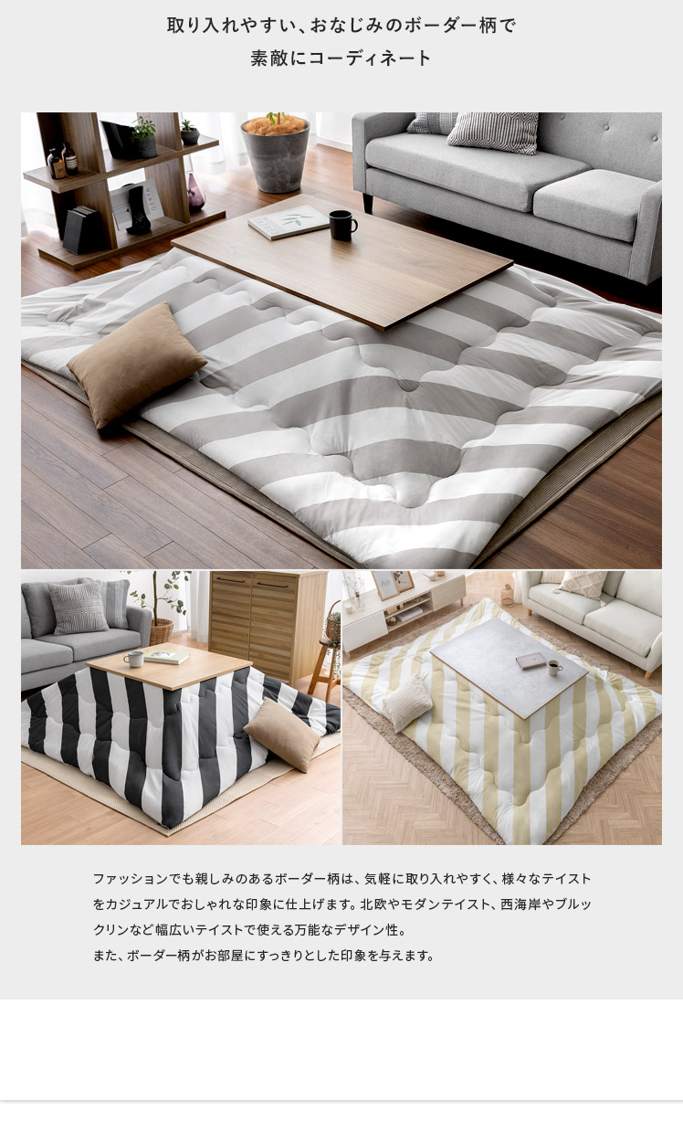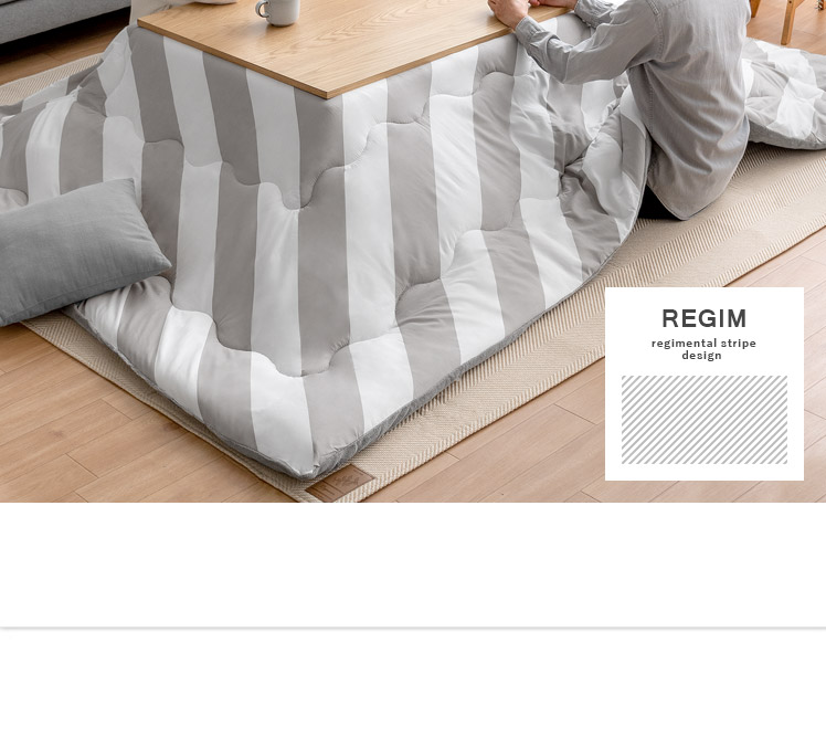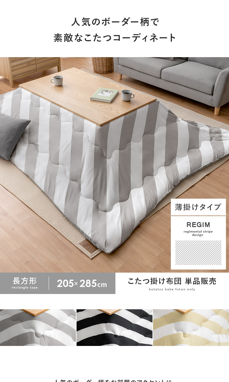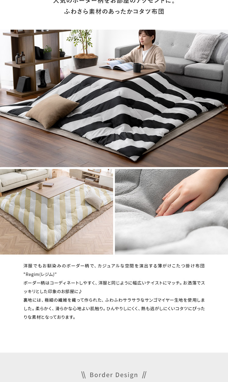 ボーダー薄掛けこたつ布団 REGIM(レジム)長方形 205×285cm / 洋服でもお馴染みのボーダー柄で、すっきりカジュアルな空間を演出する薄がけこたつ布団"Regim(レジム)"ボーダー柄はコーディネートがしやすく、洋服と同じように幅広いテイストにマッチ。コーディネートしやすい上に、お洒落ですっきりとした印象に仕上げてくれます♪肌の触れる裏地には、極細の繊維を織って作られた、ふわふわサラサラなサンゴマイヤー生地を使用しました。柔らかく、滑らかな心地よい肌触り。繊維の間に空気を溜め込む為、ひんやりしにくく、熱も逃がしにくいこたつにぴったりな素材となっております。こたつとしての暖かさはもちろん、デザインにもこだわったコーディネートしやすいこたつ布団で、素敵なお部屋づくりを。長方形タイプ