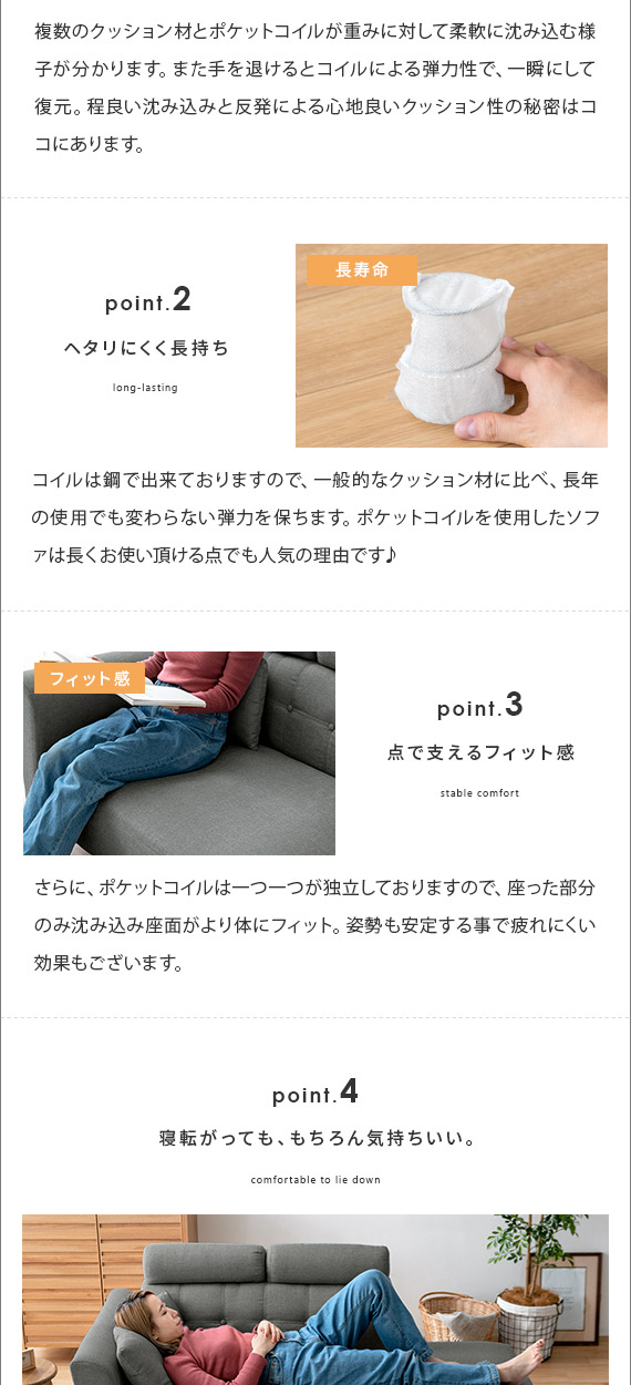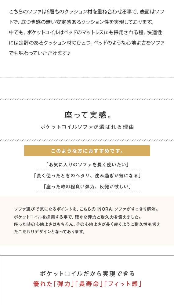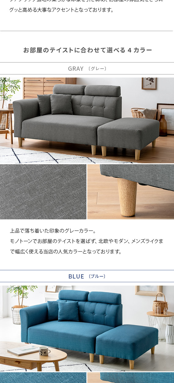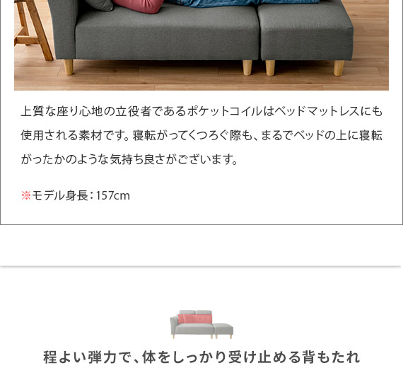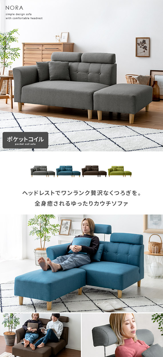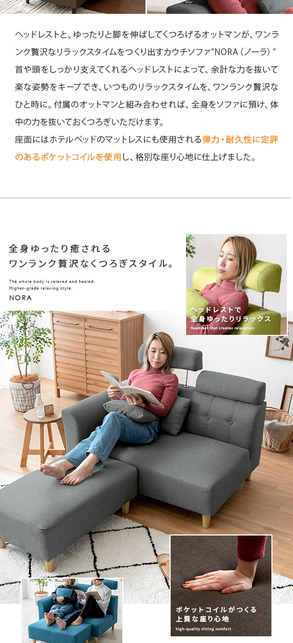 ヘッドレスト付きカウチソファ NORA(ノーラ) / ヘッドレストと、ゆったりと脚を伸ばしてくつろげるオットマンが、ワンランク贅沢なリラックスタイムをつくり出すカウチソファ”NORA(ノーラ)”首や頭をしっかり支えてくれるヘッドレストによって、余計な力を抜いて楽な姿勢をキープでき、いつものリラックスタイムを、ワンランク贅沢なひと時に。付属のオットマンと組み合わせれば、全身をソファに預け、体中の力を抜いておくつろぎいただけます。座面にはホテルベッドのマットレスにも使用される弾力・耐久性に定評のあるポケットコイルを使用し、格別な座り心地に仕上げました。ヘッドレスト付きカウチソファ”NORA(ノーラ)”で、全身癒される憩いのリビング空間をご自宅に。