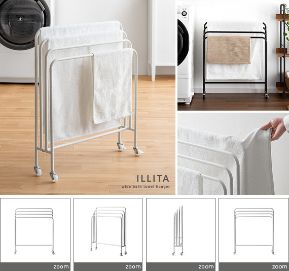 バスタオルハンガー ILLITA(イリータ) 67cmタイプ / 大きなタオルも省スペースに広げて干せる、バスタオルハンガー“ILLITA(イリータ)”タオルの重なりを防いで干せる横幅ゆったりサイズ。横からサッと干しやすいサイドフレームの無いデザイン。通気性の良い高さの違うバー設計。キャスター付きで部屋干しの移動も楽に行っていただけるなど、タオルの洗濯に必要な機能がつまったこだわりの仕上がりとなっております。充実の機能がつまった、大きなタオルも省スペースに広げて干せるタオルハンガーで毎日のお洗濯を快適に。