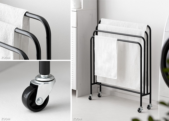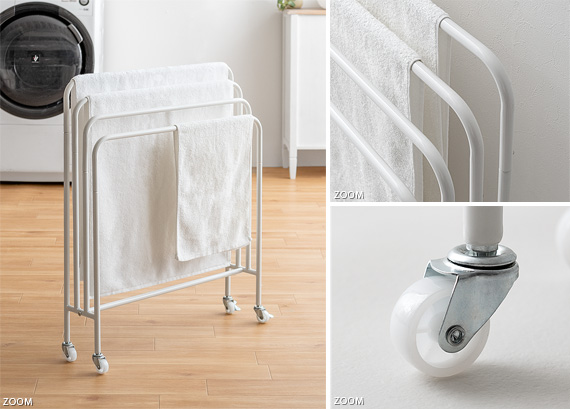 バスタオルハンガー ILLITA(イリータ) 87cmタイプ / 大きなタオルも省スペースに広げて干せる、バスタオルハンガー“ILLITA(イリータ)”タオルの重なりを防いで干せる横幅ゆったりサイズ。横からサッと干しやすいサイドフレームの無いデザイン。通気性の良い高さの違うバー設計。キャスター付きで部屋干しの移動も楽に行っていただけるなど、タオルの洗濯に必要な機能がつまったこだわりの仕上がりとなっております。充実の機能がつまった、大きなタオルも省スペースに広げて干せるタオルハンガーで毎日のお洗濯を快適に。