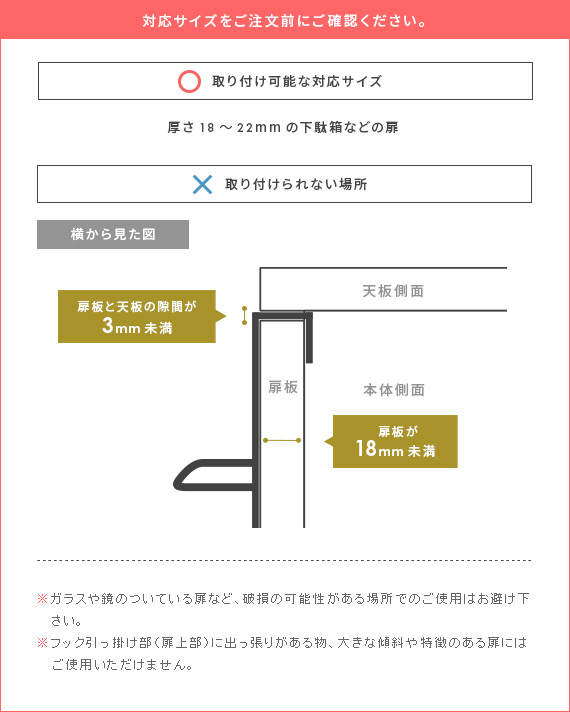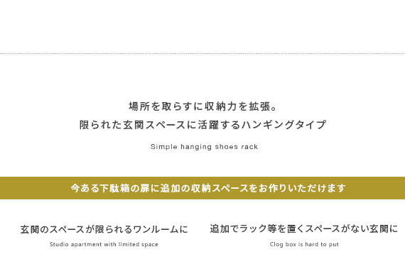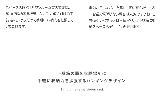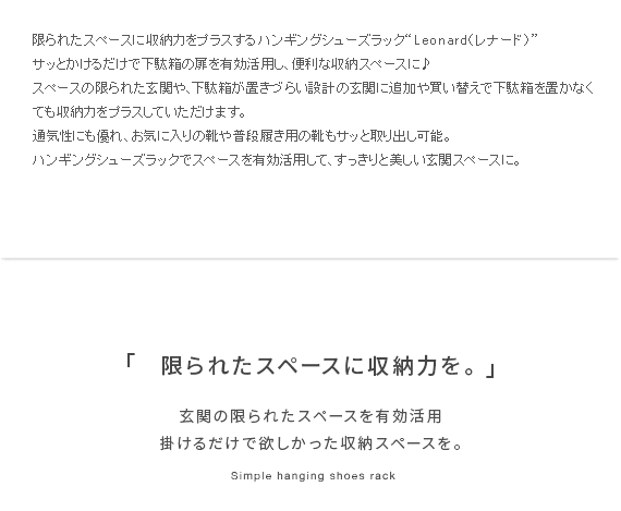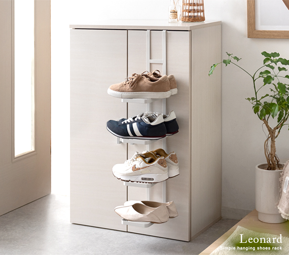 限られたスペースに収納力をプラスするハンギングシューズラック“Leonard(レナード)”サッとかけるだけで下駄箱の扉を有効活用し、便利な収納スペースに♪スペースの限られた玄関や、下駄箱が置きづらい設計の玄関に追加や買い替えで下駄箱を置かなくても収納力をプラスしていただけます。通気性にも優れ、お気に入りの靴や普段履き用の靴もサッと取り出し可能。ハンギングシューズラックでスペースを有効活用して、すっきりと美しい玄関スペースに。
