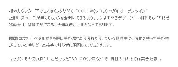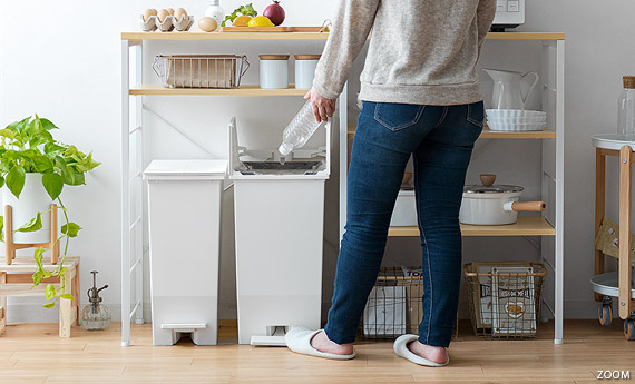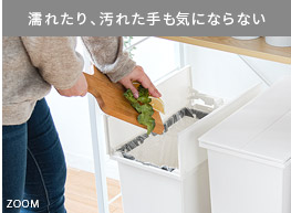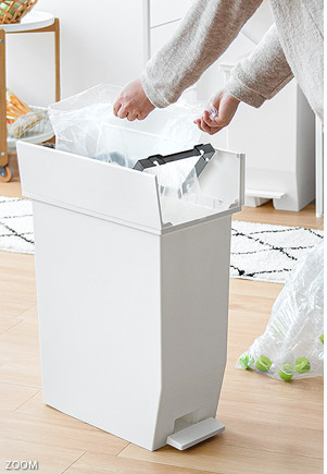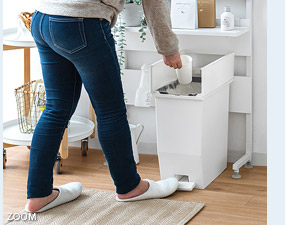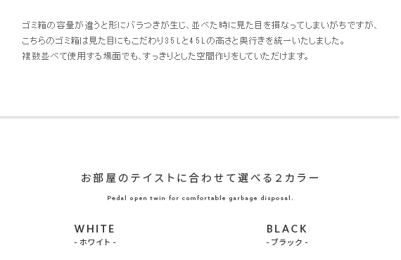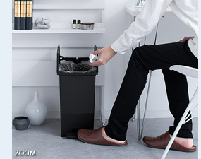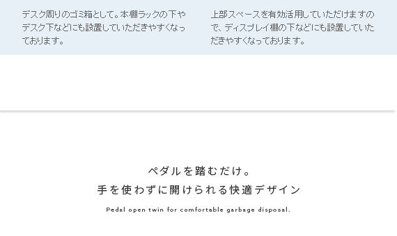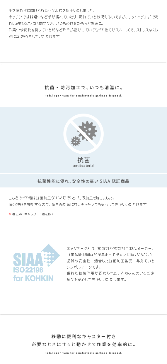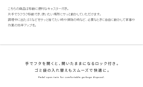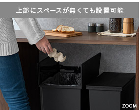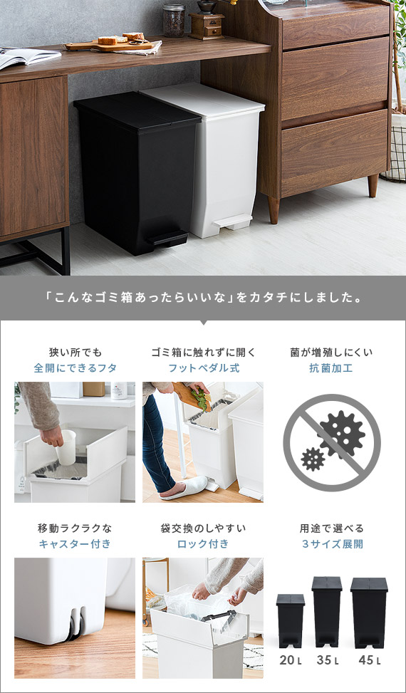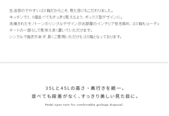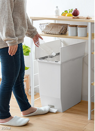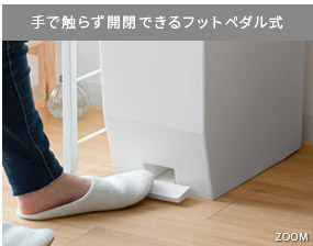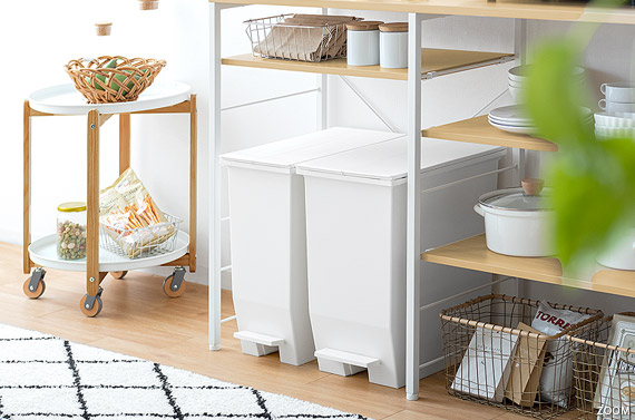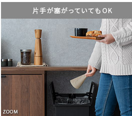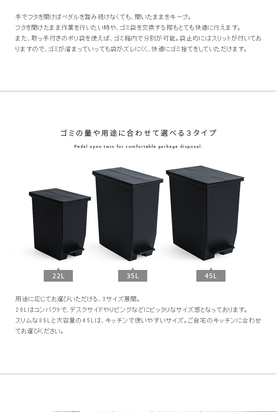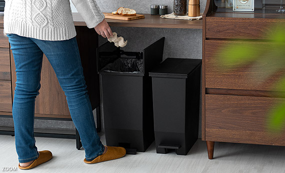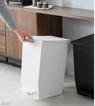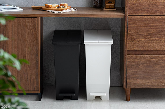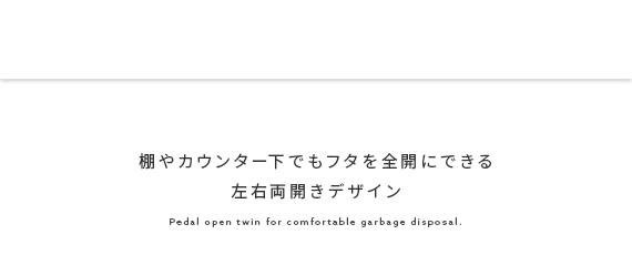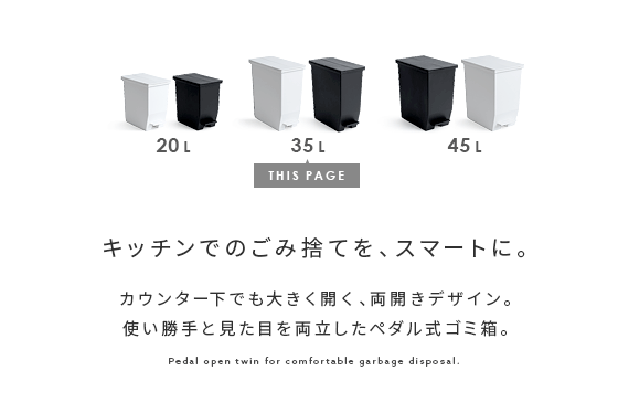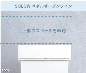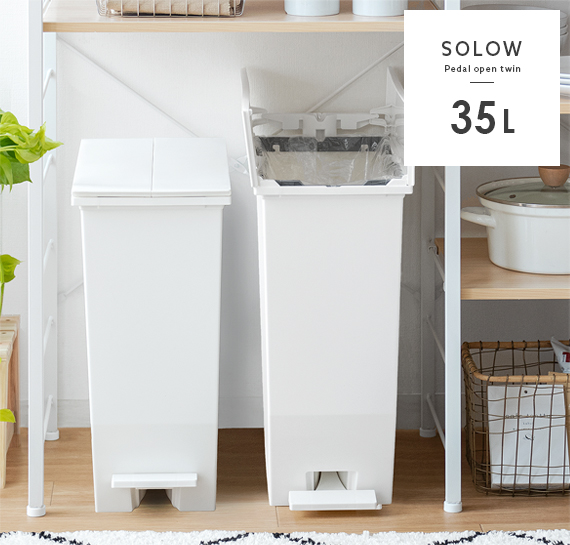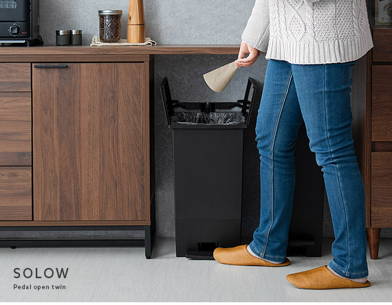 SOLOW〔ソロウ〕 ペダルオープンツイン 35L /棚やカウンター下でも大きくフタが開く、“SOLOW(ソロウ)ペダルオープンツイン”上部にスペースが無くてもフタを全開にできるよう、フタは両開きデザインに。棚下でもゴミ箱を移動せずゴミ捨てができる、快適な使い心地となっております。開閉にはフットペダル式を採用。手が濡れたり汚れたりしている調理中や、荷物を持って手が塞がっている時など、直接手で触らずに開閉していただけます。キッチンでの使い勝手にこだわった“SOLOW(ソロウ)”で、毎日のゴミ捨て作業を快適に。