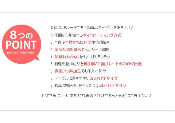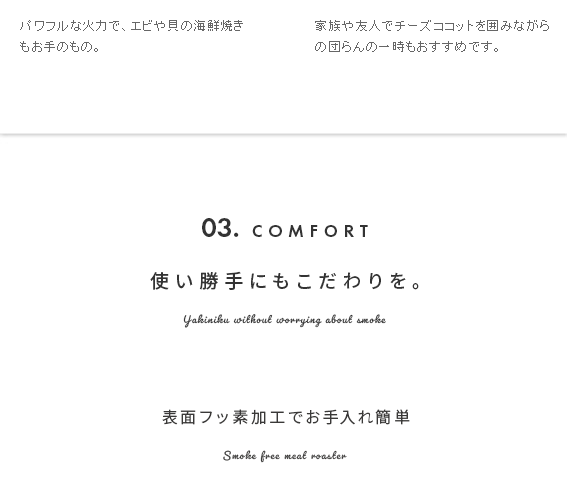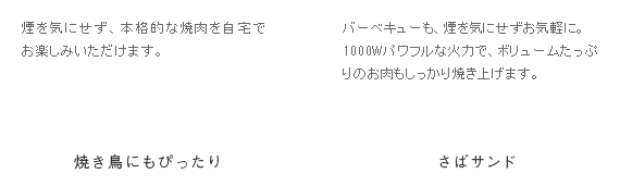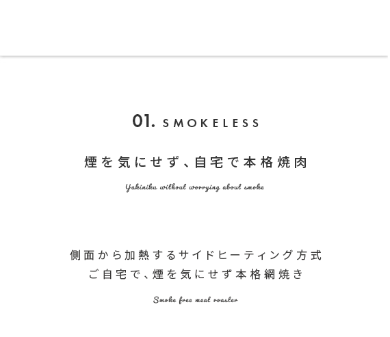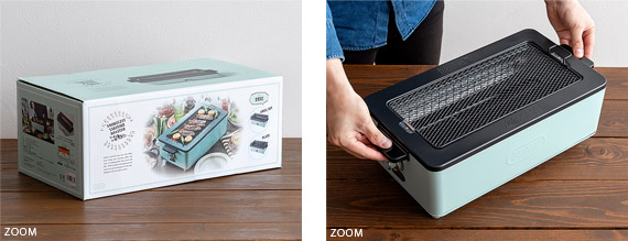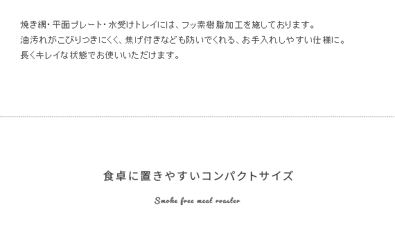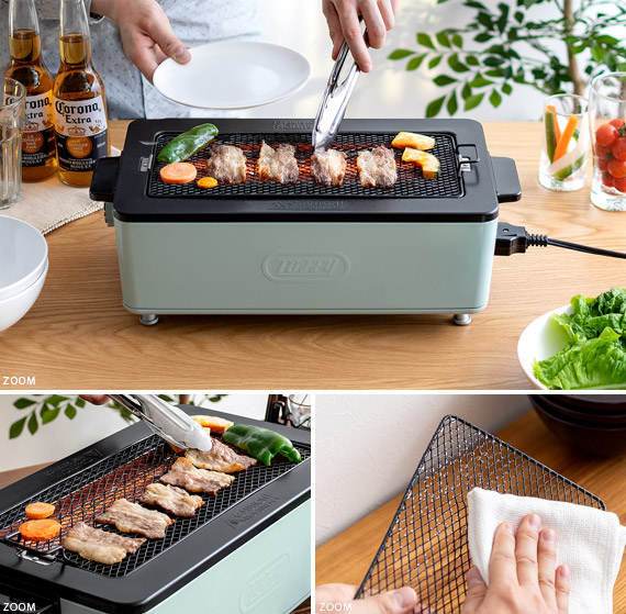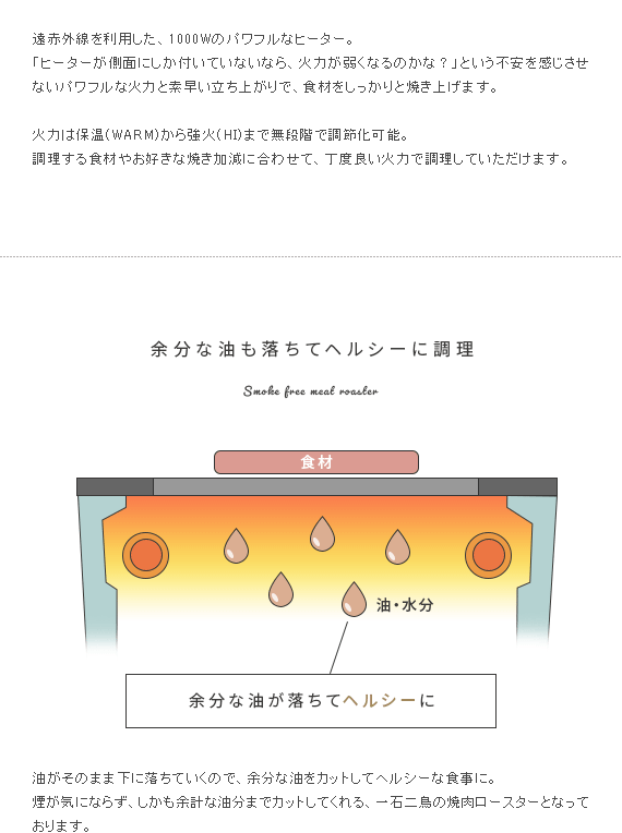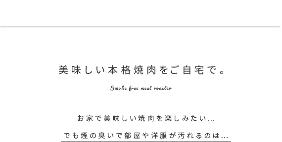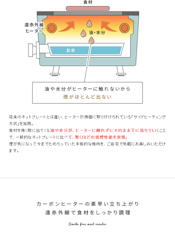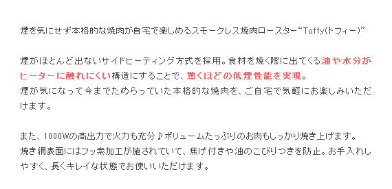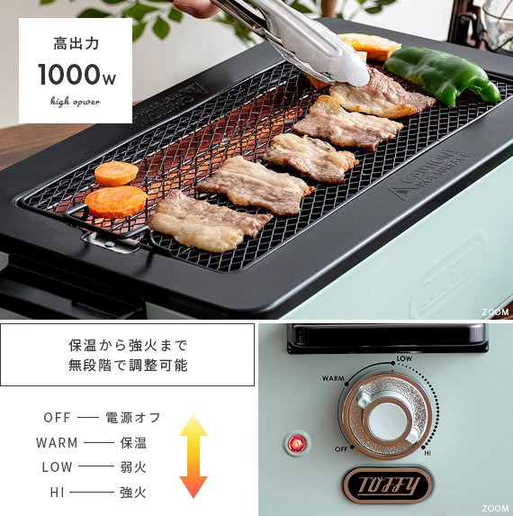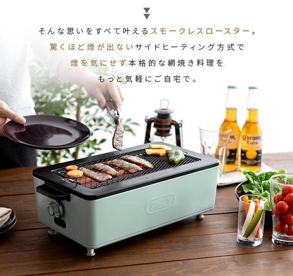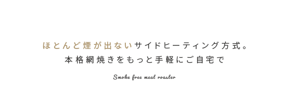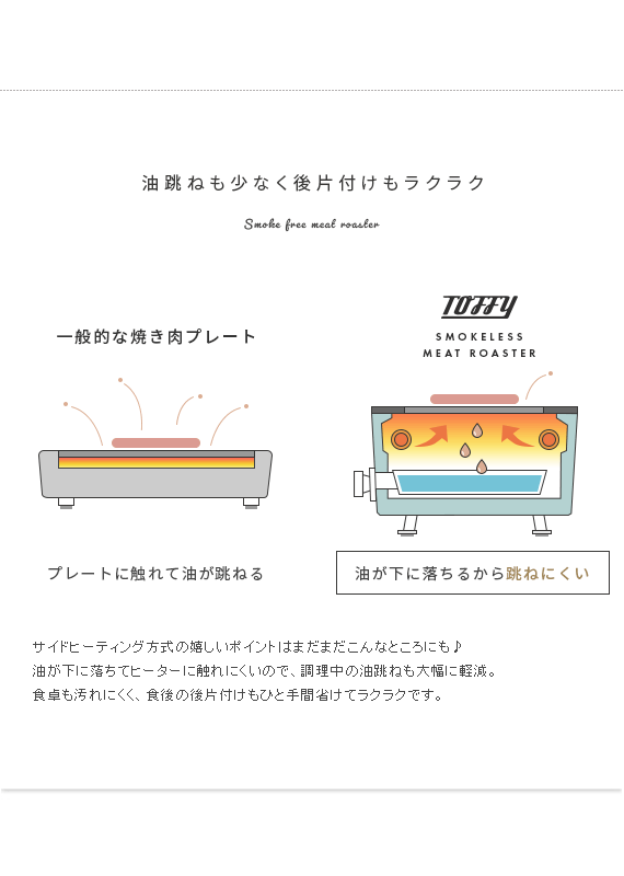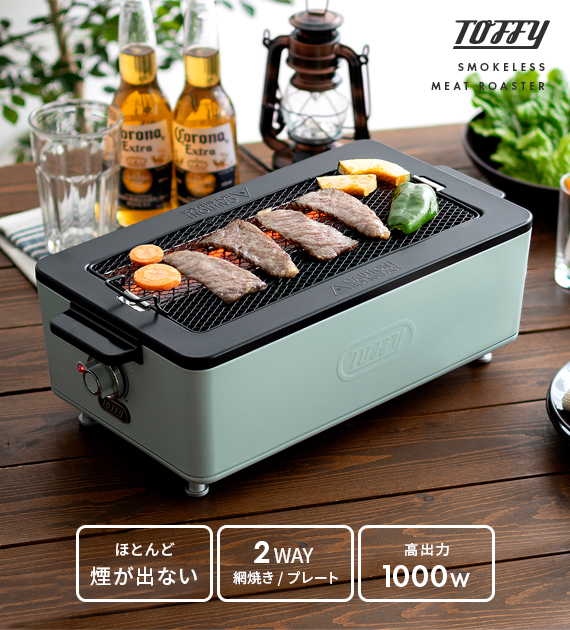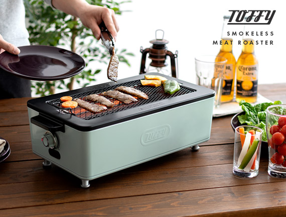 スモークレス焼肉ロースター Toffy〔トフィー〕/煙を気にせず本格的な焼肉が自宅で楽しめるスモークレス焼肉ロースター“Toffy(トフィー)”煙がほとんど出ないサイドヒーティング方式を採用。食材を焼く際に出てくる油や水分がヒーターに触れにくい構造にすることで、驚くほどの低煙性能を実現。煙が気になって今までためらっていた本格的な焼肉を、ご自宅で気軽にお楽しみいただけます。また、1000Wの高出力で火力も充分♪ボリュームたっぷりのお肉もしっかり焼き上げます。焼き網表面にはフッ素加工が施されていて、焦げ付きや油のこびりつきを防止。お手入れしやすく、長くキレイな状態でお使いいただけます。