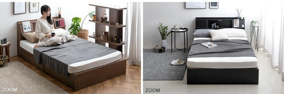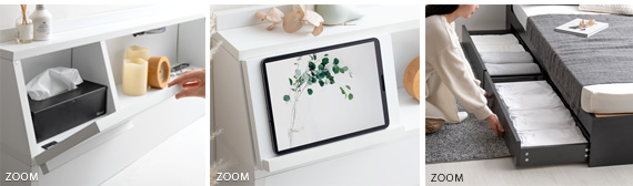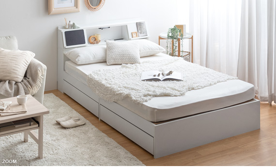 ベッド1台分の設置スペースに豊富な収納スペースを確保でき、収納家具が減らせる分空いたスペースにソファを置くなど、コーディネートの選択肢を広げます。