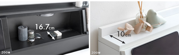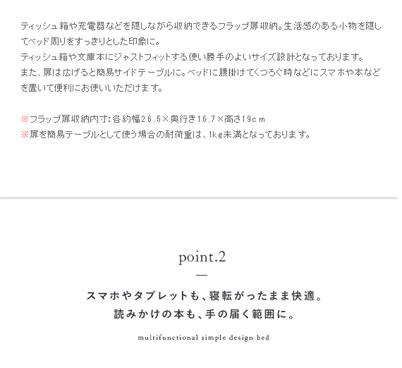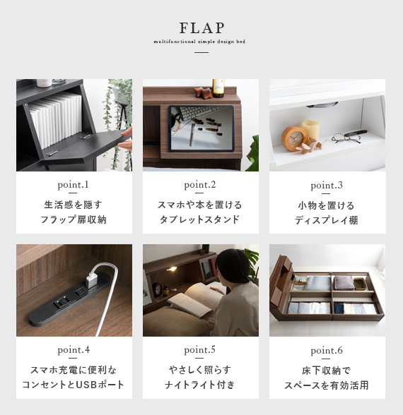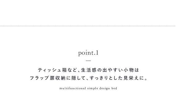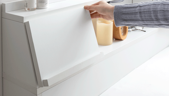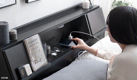ティッシュ箱や充電器などを隠しながら収納できるフラップ扉収納。生活感のある小物を隠してベッド周りをすっきりとした印象に。