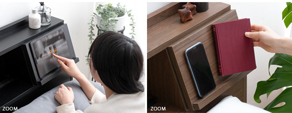 扉は広げると簡易サイドテーブルに。ベッドに腰掛けてくつろぐ時などにスマホや本などを置いて便利にお使いいただけます。