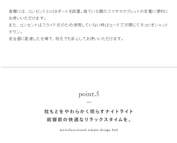こちらのベッドは枕もとをやわらかく照らすナイトライト付き。