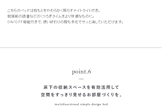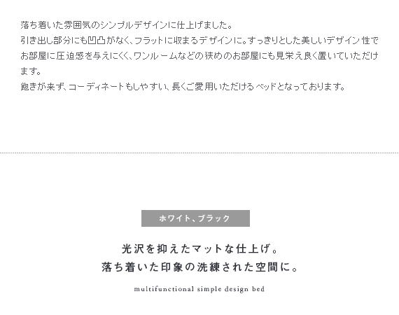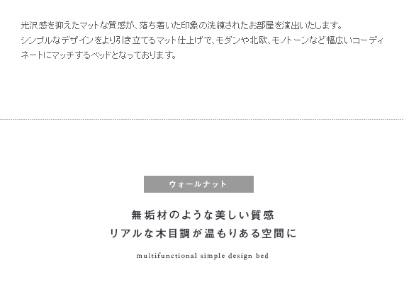 シンプルなデザインをより引き立てるマット仕上げで、モダンや北欧、モノトーンなど幅広いコーディネートにマッチするベッドとなっております。