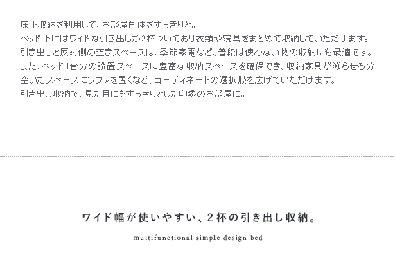 床下収納を利用して、お部屋自体をすっきりと。ベッド下にはワイドな引き出しが2杯ついており衣類や寝具をまとめて収納していただけます。