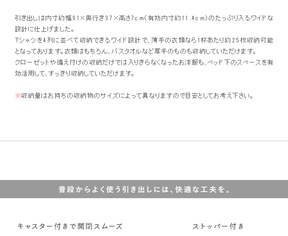 クローゼットや備え付けの収納だけでは入りきらなくなったお洋服も、ベッド下のスペースを有効活用して、すっきり収納していただけます。