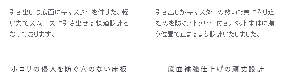 床板に裏面補強を施し細部までこだわることで、きしみにくく、耐久性のあるベッドに仕上げました。
