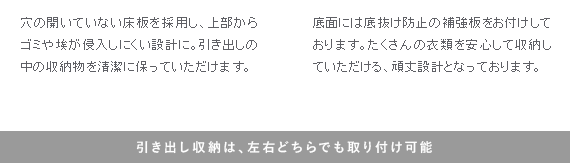 底面には底抜け防止の補強板をお付けしております。たくさんの衣類を安心して収納していただける、頑丈設計となっております。