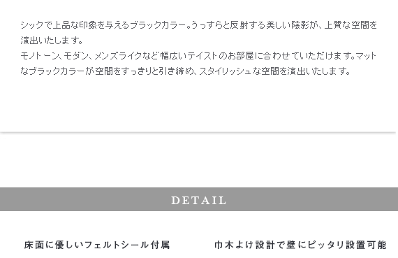 モノトーン、モダン、メンズライクなど幅広いテイストのお部屋におすすめ。マットなブラックが空間をすっきりと引き締め、スタイリッシュな空間を演出します。