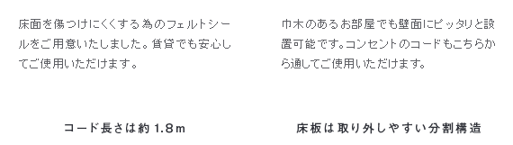 巾木のあるお部屋でも壁面にピッタリと設置可能です。コンセントのコードもこちらから通してご使用いただけます。