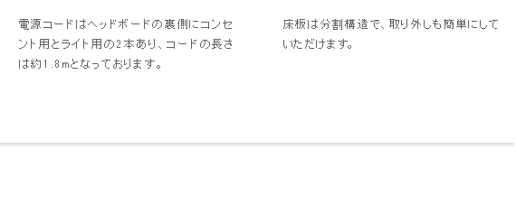 電源コードはヘッドボードの裏側にコンセント用とライト用の2本あり、コードの長さは約1.8mとなっております。
