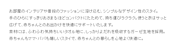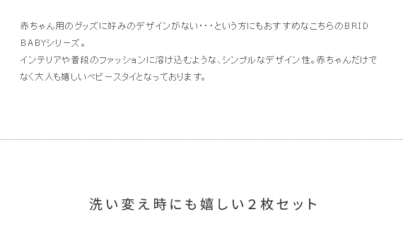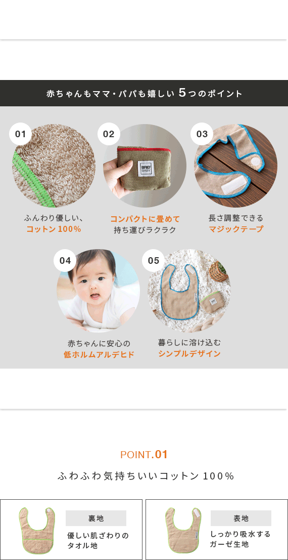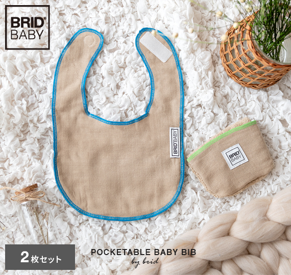 BRID BABY ポケッタブルスタイ 2個セット/お部屋のインテリアや普段のファッションに溶け込む、シンプルなデザイン性のスタイ。手のひらにすっきりおさまるほどコンパクトにたためて、持ち運びラクラク。使うときはサッと広げて、赤ちゃんとのお出かけを快適にサポートいたします。素材には、ふわふわ気持ちいいタオル地に、しっかりよだれを吸収するガーゼ生地を採用。赤ちゃんもママ・パパも嬉しいスタイで、赤ちゃんとの暮らしを心地よく快適に。