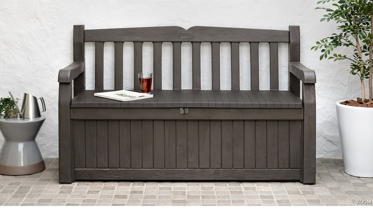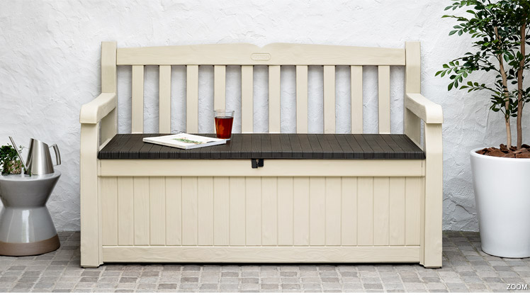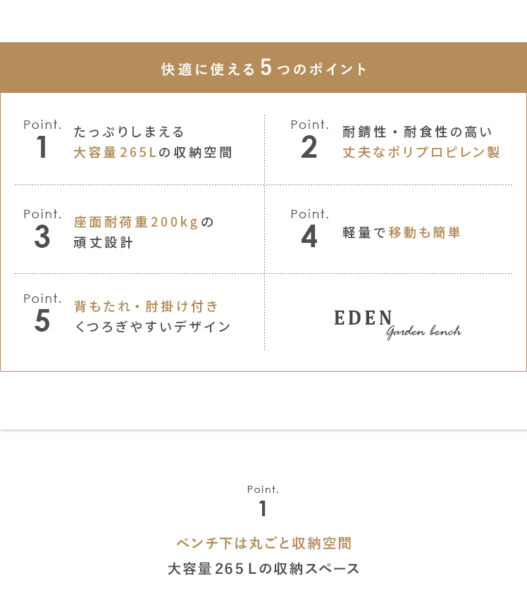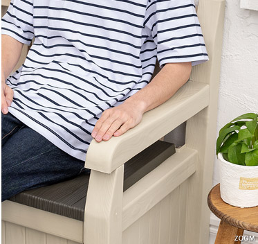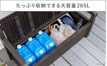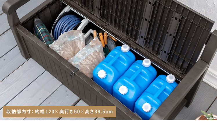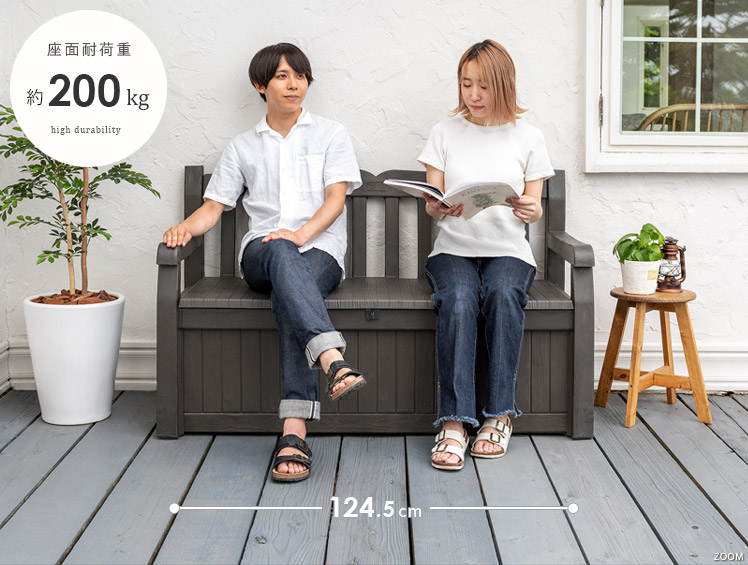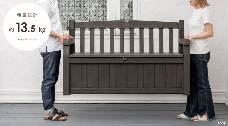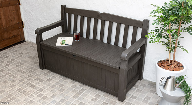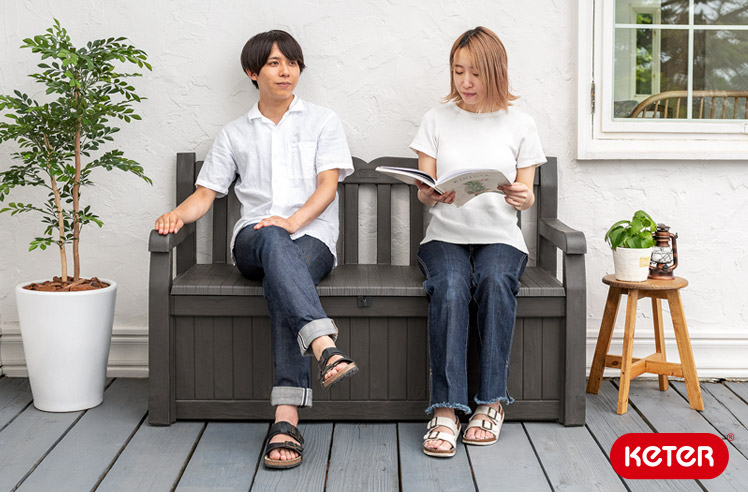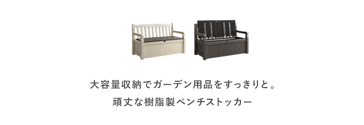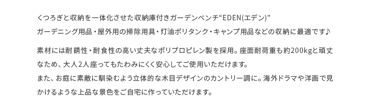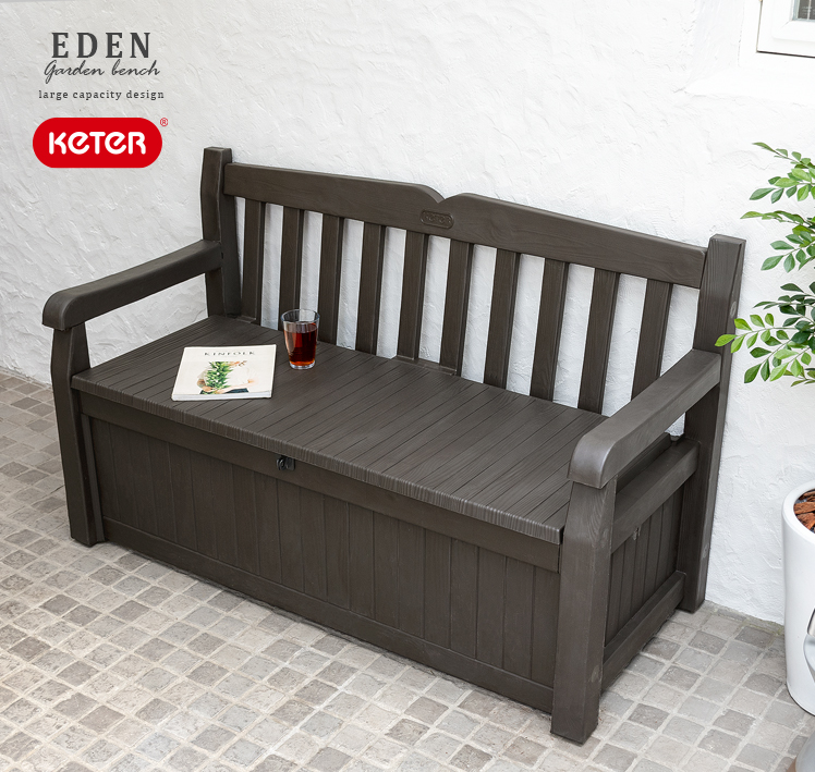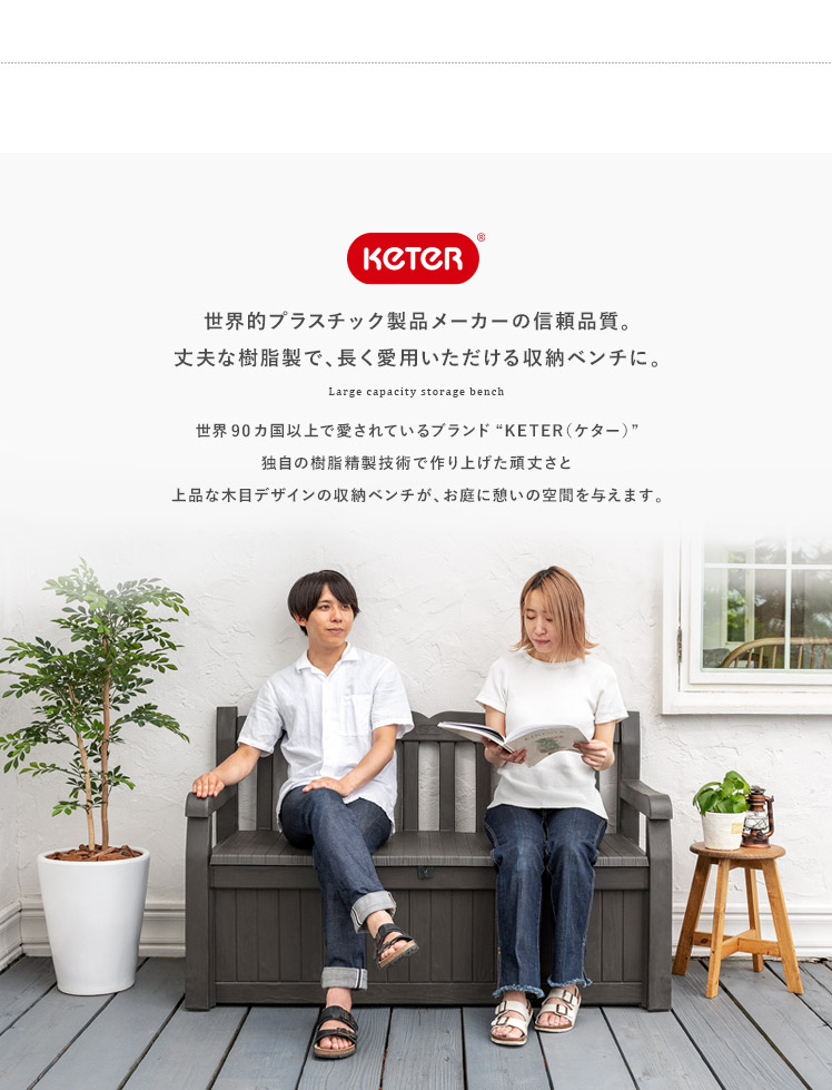 keter(ケター) 収納庫付きガーデンベンチ EDEN(エデン)/くつろぎと収納を一体化させた収納庫付きガーデンベンチ“EDEN(エデン)”ガーデニング用品・屋外用の掃除用具・灯油ポリタンク・キャンプ用品などの収納に最適です♪素材には耐錆性・耐食性の高い丈夫なポリプロプレン製を採用。耐荷重も約200kgと頑丈なため、大人2人座ってもたわみにくく安心してご使用いただけます。また、お庭に素敵に馴染むよう立体的な木目デザインのカントリー調に。海外ドラマや洋画で見かけるような上品な景色をご自宅に作っていただけます。収納を兼ね備えた一台二役のベンチで、ご自宅のお庭やベランダを見栄え良く、優雅なひとときを。