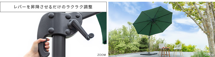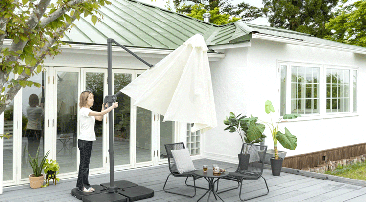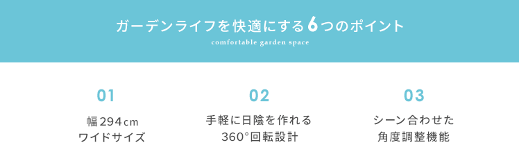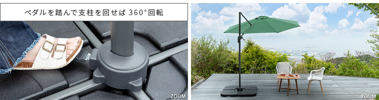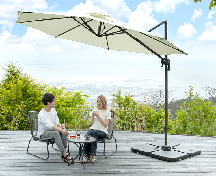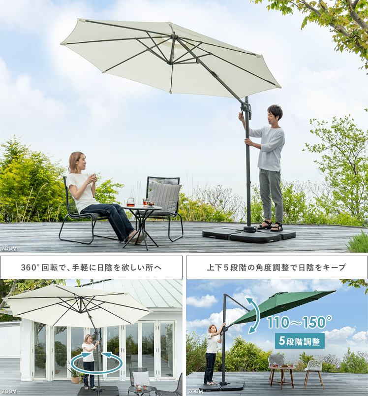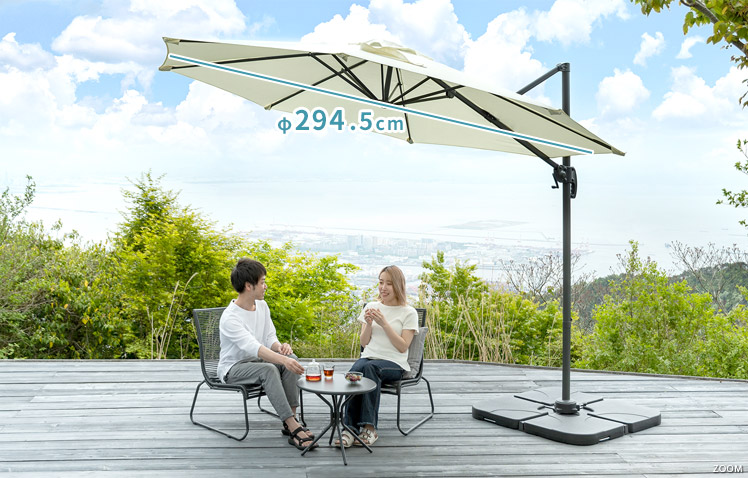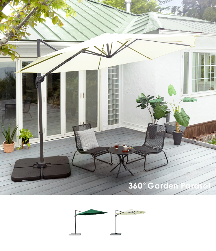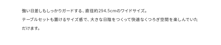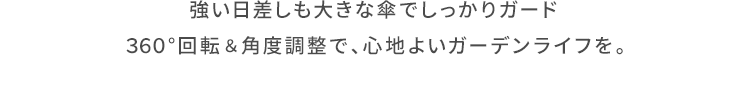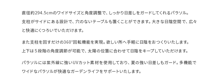 360度ガーデンパラソル/直径約294.5cmのワイドサイズと角度調整で、しっかり日差しをガードしてくれるパラソル。支柱がサイドにある設計で、穴のないテーブルも置くことができます。大きな日陰空間で、広々と快適にくつろいでいただけます。また支柱を回すだけの360度回転機能を実現。欲しい所へ手軽に日陰をおつくりいたします。上下は5段階の角度調節が可能で、太陽の位置に合わせて日陰をキープしていただけます。パラソルには紫外線に強いUVカット素材を使用しており、夏の強い日差しもガード。多機能でワイドなパラソルが快適なガーデンライフをサポートいたします。
