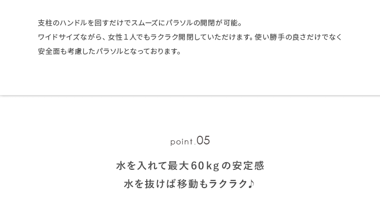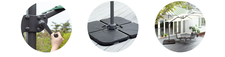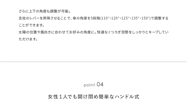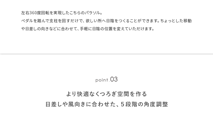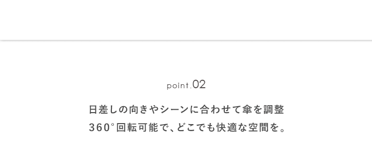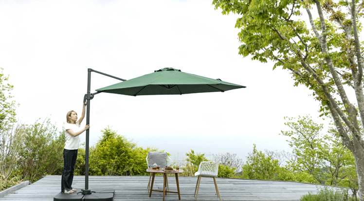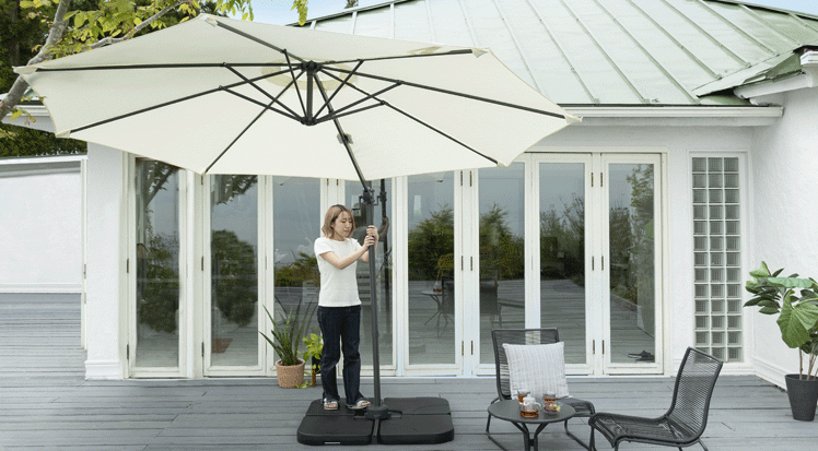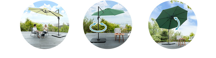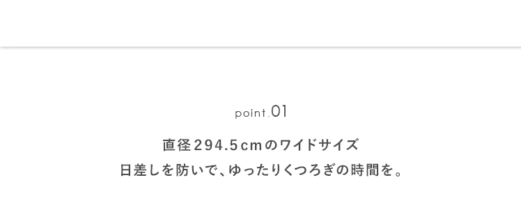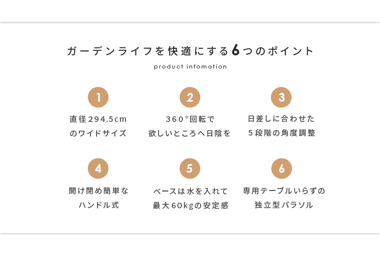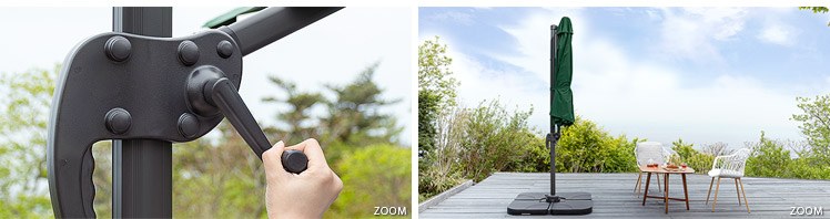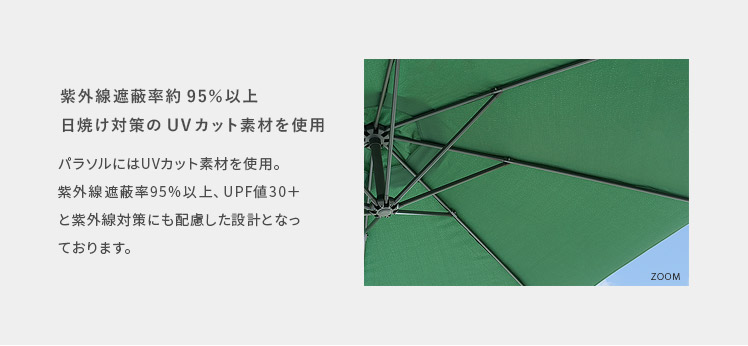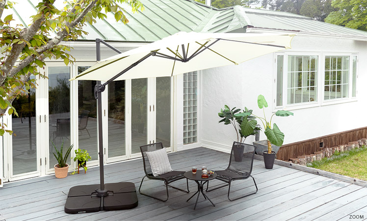360度ガーデンパラソル/直径約294.5cmのワイドサイズと角度調整で、しっかり日差しをガードしてくれるパラソル。支柱がサイドにある設計で、穴のないテーブルも置くことができます。大きな日陰空間で、広々と快適にくつろいでいただけます。また支柱を回すだけの360度回転機能を実現。欲しい所へ手軽に日陰をおつくりいたします。上下は5段階の角度調節が可能で、太陽の位置に合わせて日陰をキープしていただけます。パラソルには紫外線に強いUVカット素材を使用しており、夏の強い日差しもガード。多機能でワイドなパラソルが快適なガーデンライフをサポートいたします。