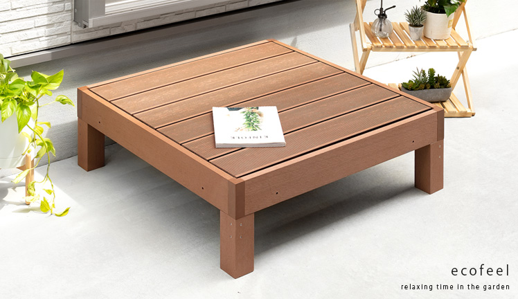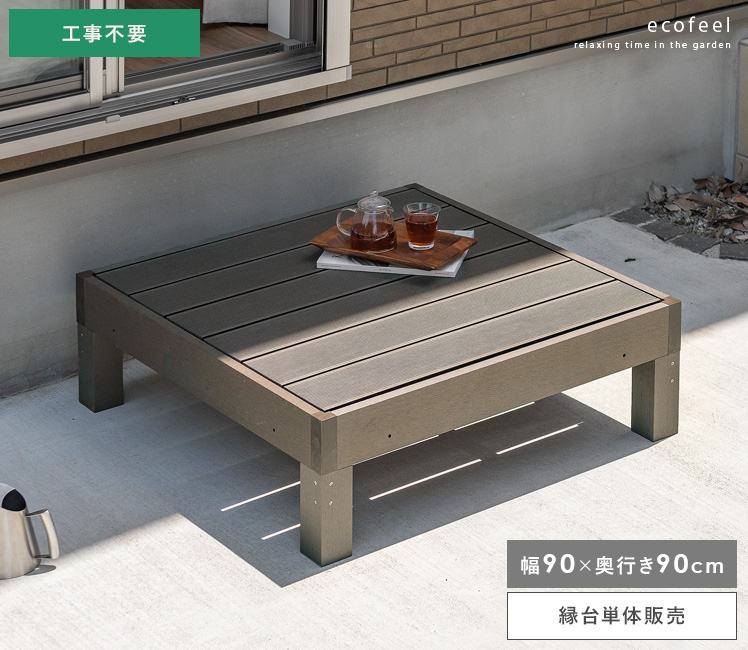 人工木ウッドデッキ ecofeel〔エコフィール〕縁台単体販売/庭先にくつろぎスペースを手軽につくるウッドデッキ”ecofeel(エコフィール)”工事不要で簡単設置、組立て後すぐに快適なスペースをお作りいたします。人工木を使用しており耐久性が高く、虫害や腐食の心配がありません。天然木のような美しい見た目ながらも、日々のメンテナンスが簡単で長くきれいにご愛用していただけます。また、独立タイプで4つのパーツを販売しており、レイアウトも自由自在。お庭にあったレイアウトで、くつろぎのスペースをおつくりいただけます。
