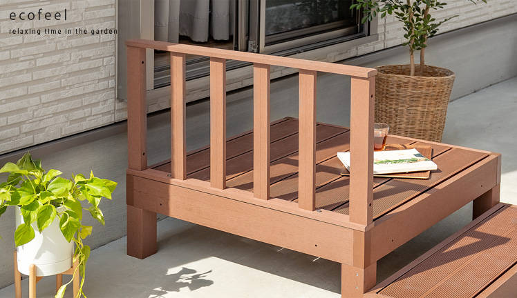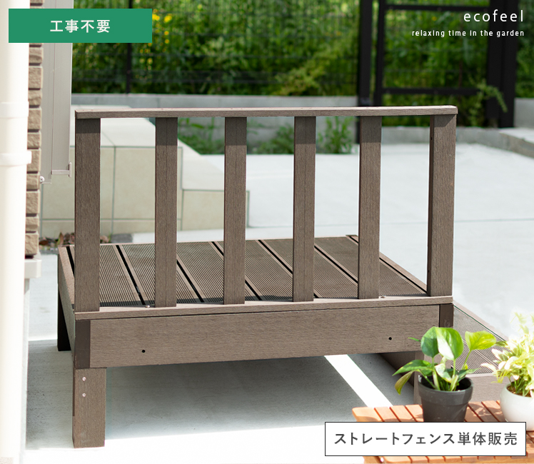 人工木ウッドデッキ ecofeel〔エコフィール〕ストレートフェンス単体販売/庭先にくつろぎスペースを手軽につくるウッドデッキ”ecofeel(エコフィール)”工事不要で簡単設置、組立て後すぐに快適なスペースをお作りいたします。人工木を使用しており耐久性が高く、虫害や腐食の心配がありません。天然木のような美しい見た目ながらも、日々のメンテナンスが簡単で長くきれいにご愛用していただけます。また、独立タイプで4つのパーツを販売しており、レイアウトも自由自在。お庭にあったレイアウトで、くつろぎのスペースをおつくりいただけます。