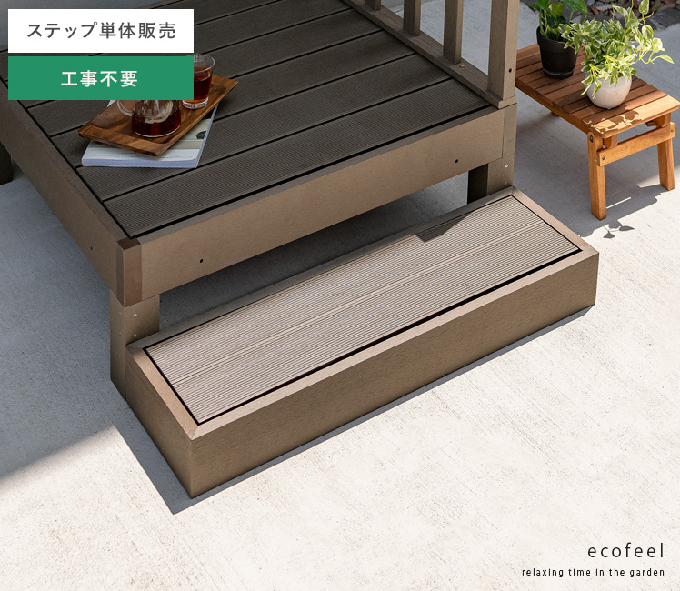人工木ウッドデッキ ecofeel〔エコフィール〕ステップ単体販売/庭先にくつろぎスペースを手軽につくるウッドデッキ”ecofeel(エコフィール)”工事不要で簡単設置、組立て後すぐに快適なスペースをお作りいたします。人工木を使用しており耐久性が高く、虫害や腐食の心配がありません。天然木のような美しい見た目ながらも、日々のメンテナンスが簡単で長くきれいにご愛用していただけます。また、独立タイプで4つのパーツを販売しており、レイアウトも自由自在。お庭にあったレイアウトで、くつろぎのスペースをおつくりいただけます。