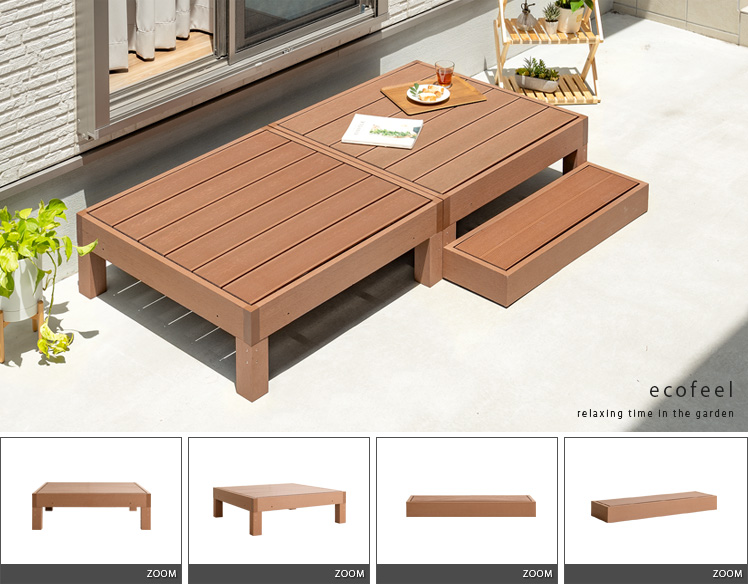 人工木ウッドデッキ ecofeel〔エコフィール〕縁台2台+ステップセット/庭先にくつろぎスペースを手軽につくるウッドデッキ”ecofeel(エコフィール)”工事不要で簡単設置、組立て後すぐに快適なスペースをお作りいたします。人工木を使用しており耐久性が高く、虫害や腐食の心配がありません。天然木のような美しい見た目ながらも、日々のメンテナンスが簡単で長くきれいにご愛用していただけます。また、独立タイプで4つのパーツを販売しており、レイアウトも自由自在。お庭にあったレイアウトで、くつろぎのスペースをおつくりいただけます。