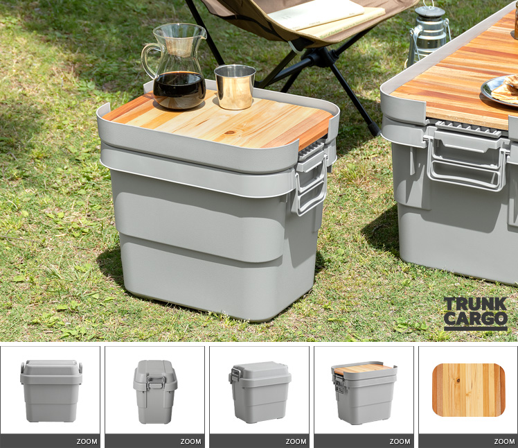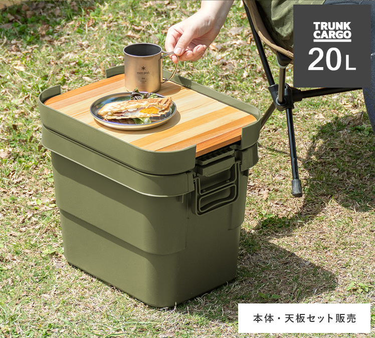 TRUNK CARGO〔トランクカーゴ〕 20Lタイプ 本体・天板セット販売/本体に天板を乗せるだけで、テーブルになる収納ボックス“TRUNK CARGO(トランクカーゴ)”たっぷり入る収納力に加え、フタを裏返して天板を乗せるだけでテーブルとしても活躍。さらに、大人が座っても安心な耐荷重100kg設計で、気軽に腰かけられるスツールとしてもご使用いただけます。また、ラフに仕上げた手作り風の天然木天板と、本体のマットな質感が、ワンランク上のアウトドアシーンを演出いたします。1台3役活躍する収納ボックスで、余分な荷物を減らしてキャンプやアウトドアシーンを快適に。