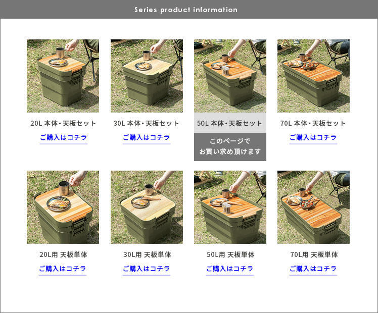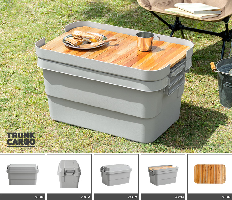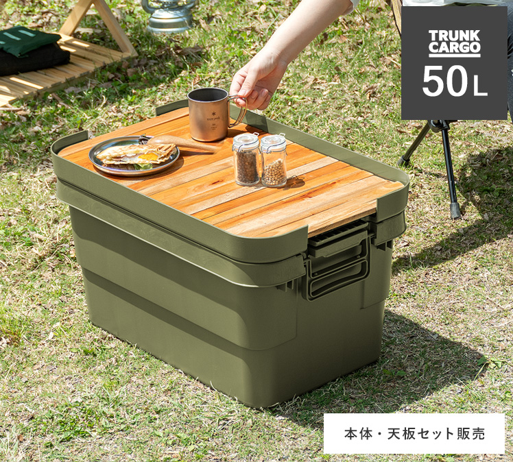 TRUNK CARGO〔トランクカーゴ〕 50Lタイプ 本体・天板セット販売/本体に天板を乗せるだけで、テーブルになる収納ボックス“TRUNK CARGO(トランクカーゴ)”たっぷり入る収納力に加え、フタを裏返して天板を乗せるだけでテーブルとしても活躍。さらに、大人が座っても安心な耐荷重100kg設計で、気軽に腰かけられるスツールとしてもご使用いただけます。また、ラフに仕上げた手作り風の天然木天板と、本体のマットな質感が、ワンランク上のアウトドアシーンを演出いたします。1台3役活躍する収納ボックスで、余分な荷物を減らしてキャンプやアウトドアシーンを快適に。