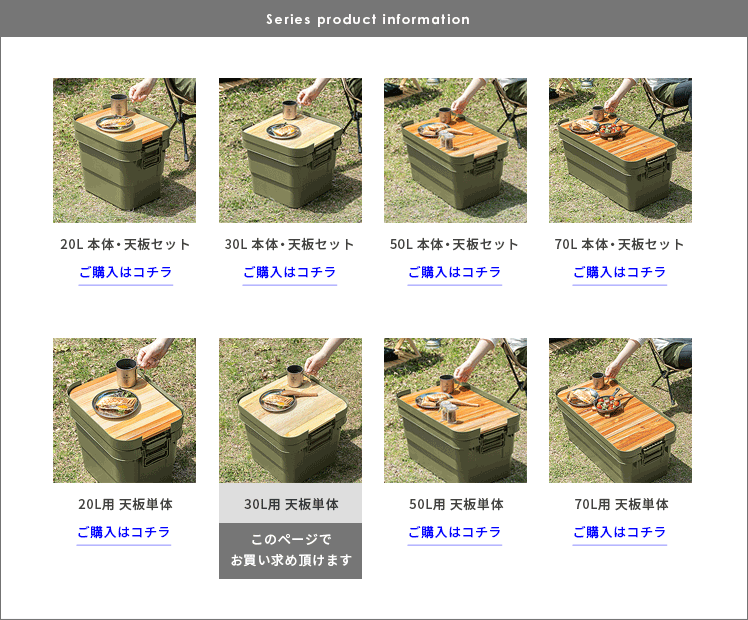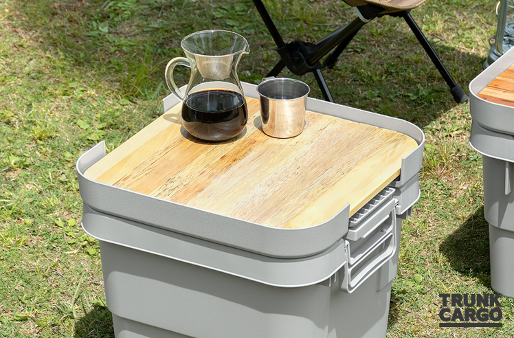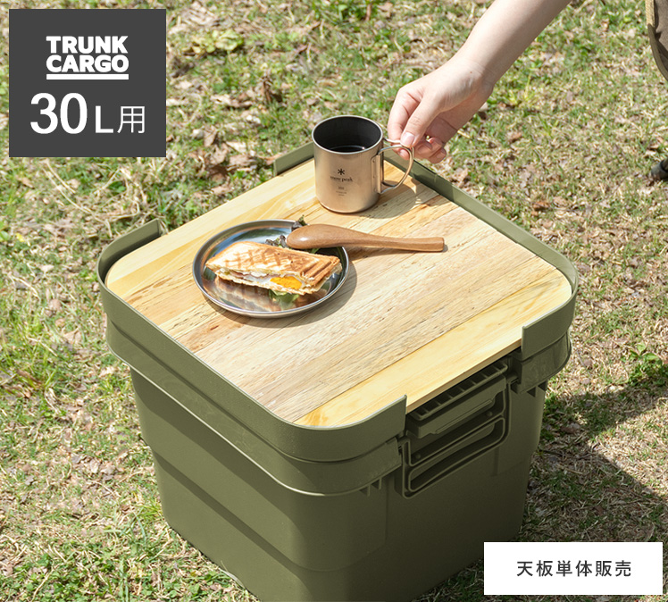 TRUNK CARGO〔トランクカーゴ〕 30Lタイプ用 天板単体販売/本体に天板を乗せるだけで、テーブルになる収納ボックス“TRUNK CARGO(トランクカーゴ)”たっぷり入る収納力に加え、フタを裏返して天板を乗せるだけでテーブルとしても活躍。さらに、大人が座っても安心な耐荷重100kg設計で、気軽に腰かけられるスツールとしてもご使用いただけます。また、ラフに仕上げた手作り風の天然木天板と、本体のマットな質感が、ワンランク上のアウトドアシーンを演出いたします。1台3役活躍する収納ボックスで、余分な荷物を減らしてキャンプやアウトドアシーンを快適に。
