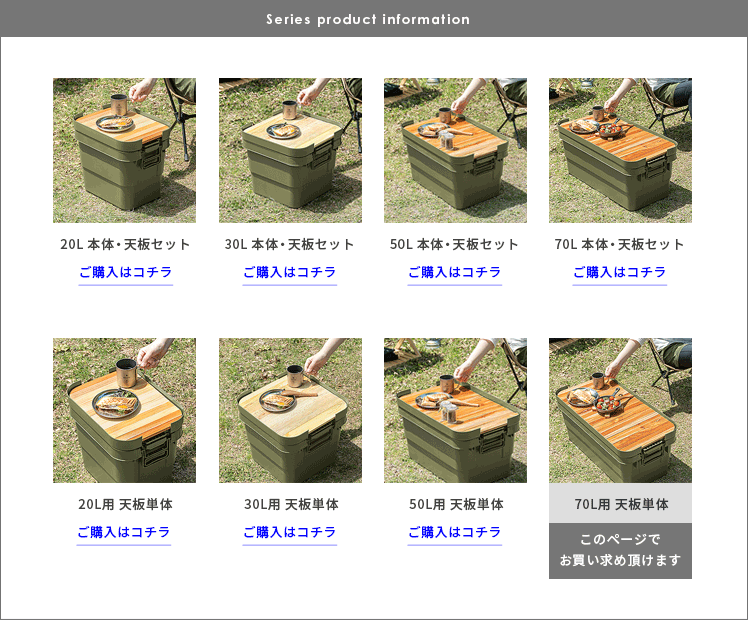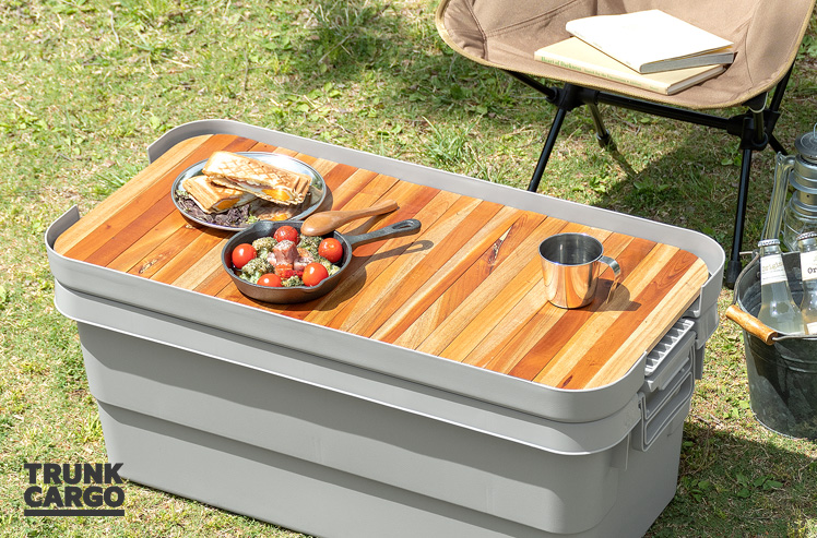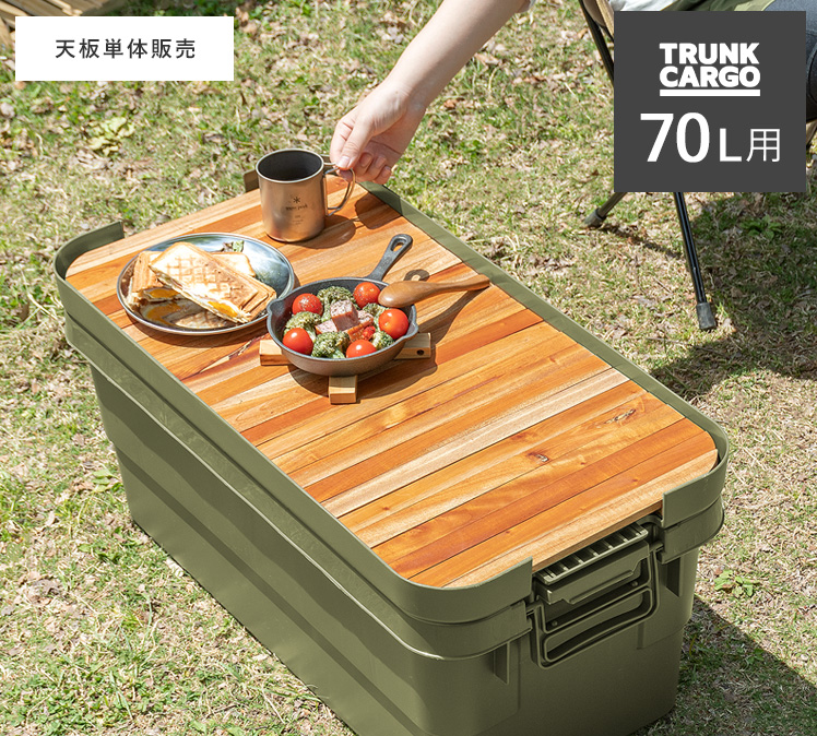 TRUNK CARGO〔トランクカーゴ〕 70Lタイプ用 天板単体販売/本体に天板を乗せるだけで、テーブルになる収納ボックス“TRUNK CARGO(トランクカーゴ)”たっぷり入る収納力に加え、フタを裏返して天板を乗せるだけでテーブルとしても活躍。さらに、大人が座っても安心な耐荷重100kg設計で、気軽に腰かけられるスツールとしてもご使用いただけます。また、ラフに仕上げた手作り風の天然木天板と、本体のマットな質感が、ワンランク上のアウトドアシーンを演出いたします。1台3役活躍する収納ボックスで、余分な荷物を減らしてキャンプやアウトドアシーンを快適に。