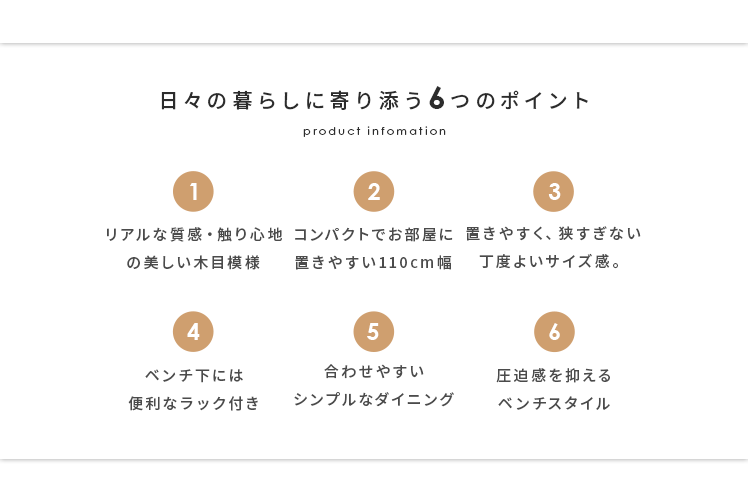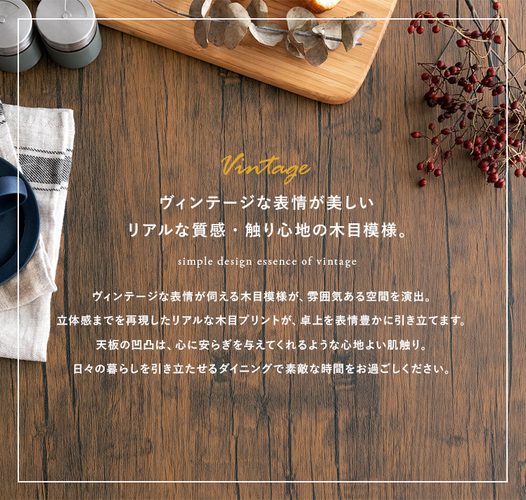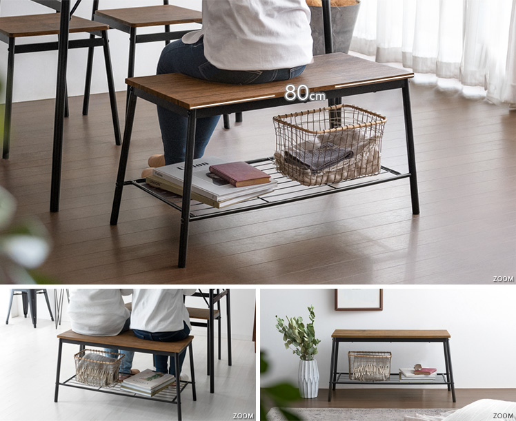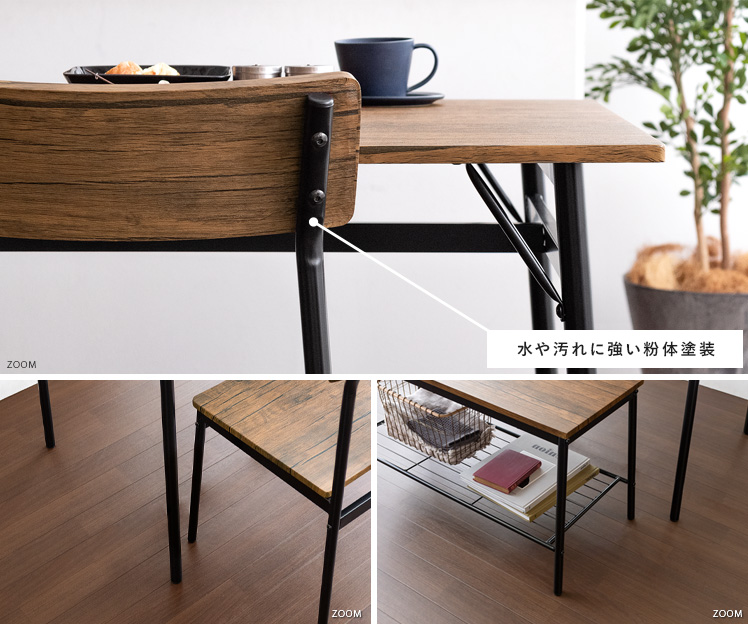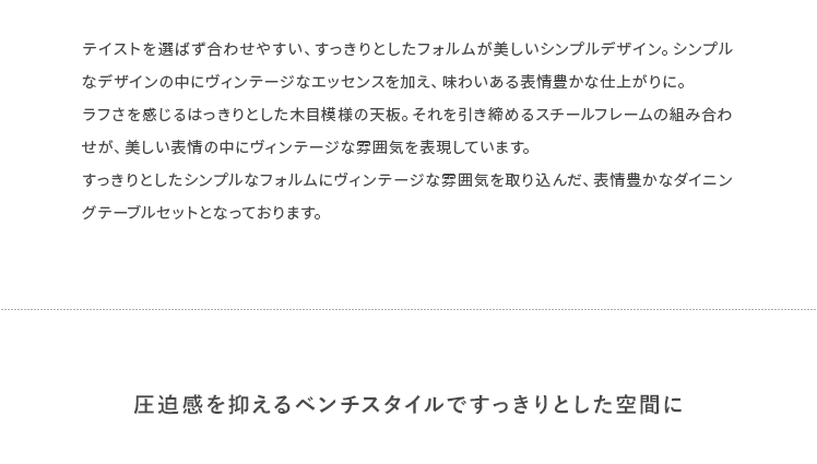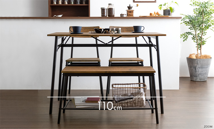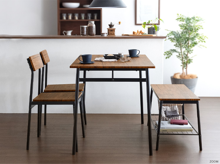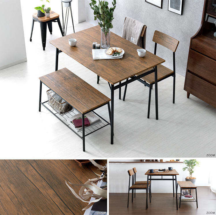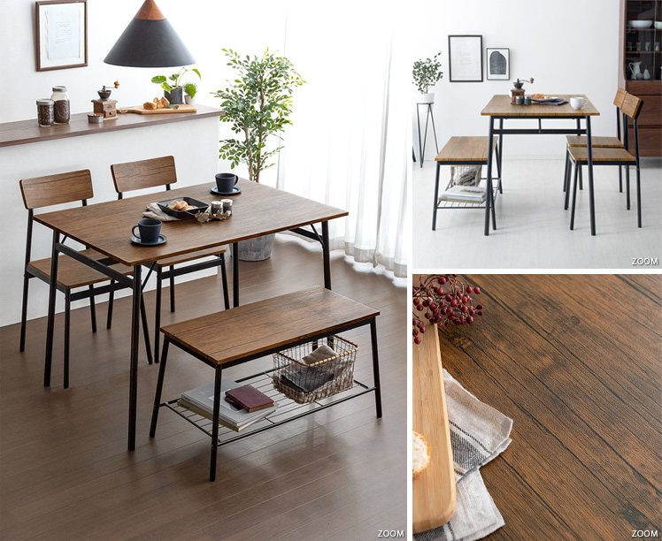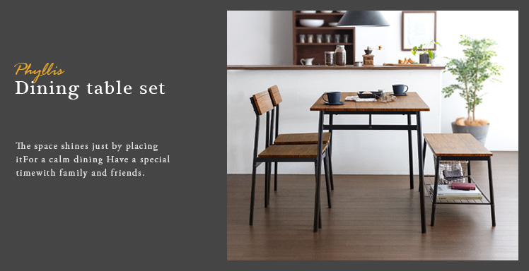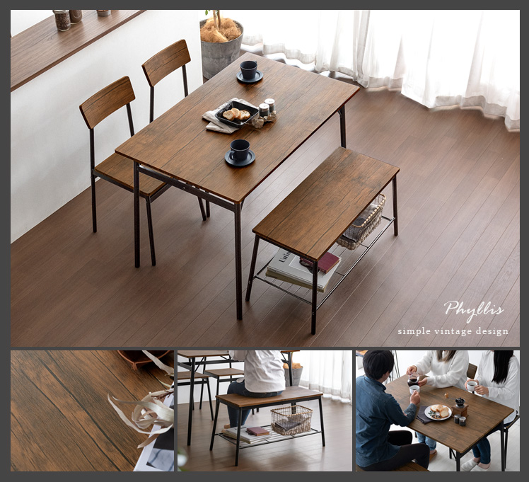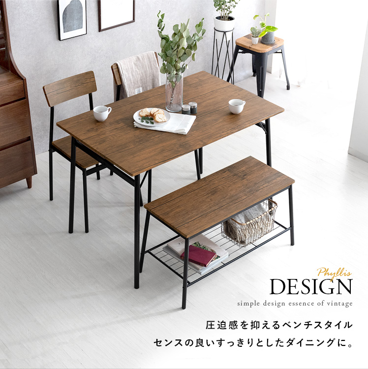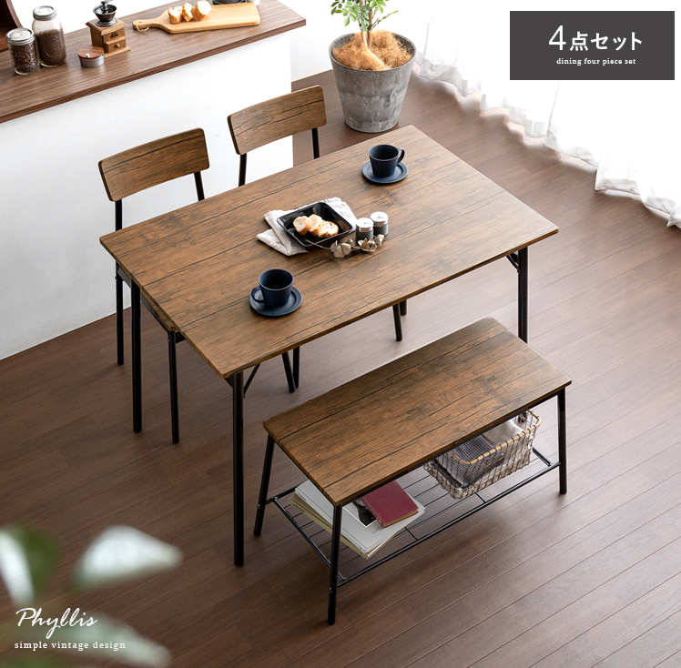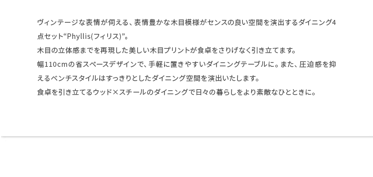 ダイニング4点セット Phyllis〔フィリス〕/ヴィンテージな表情が伺える、表情豊かな木目模様がセンスの良い空間を演出するダイニング4点セット“Phyllis(フィリス)”。木目の立体感までを再現した美しい木目プリントが食卓をさりげなく引き立てます。幅110cmの省スペースデザインで、手軽に置きやすいダイニングテーブルに。また、圧迫感を抑えるベンチスタイルはすっきりとしたダイニング空間を演出いたします。食卓を引き立てるウッド×スチールのダイニングで日々の暮らしをより素敵なひとときに。