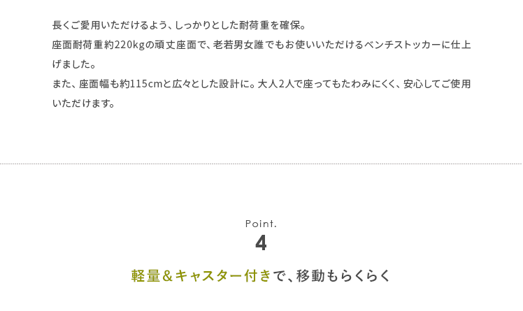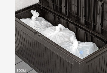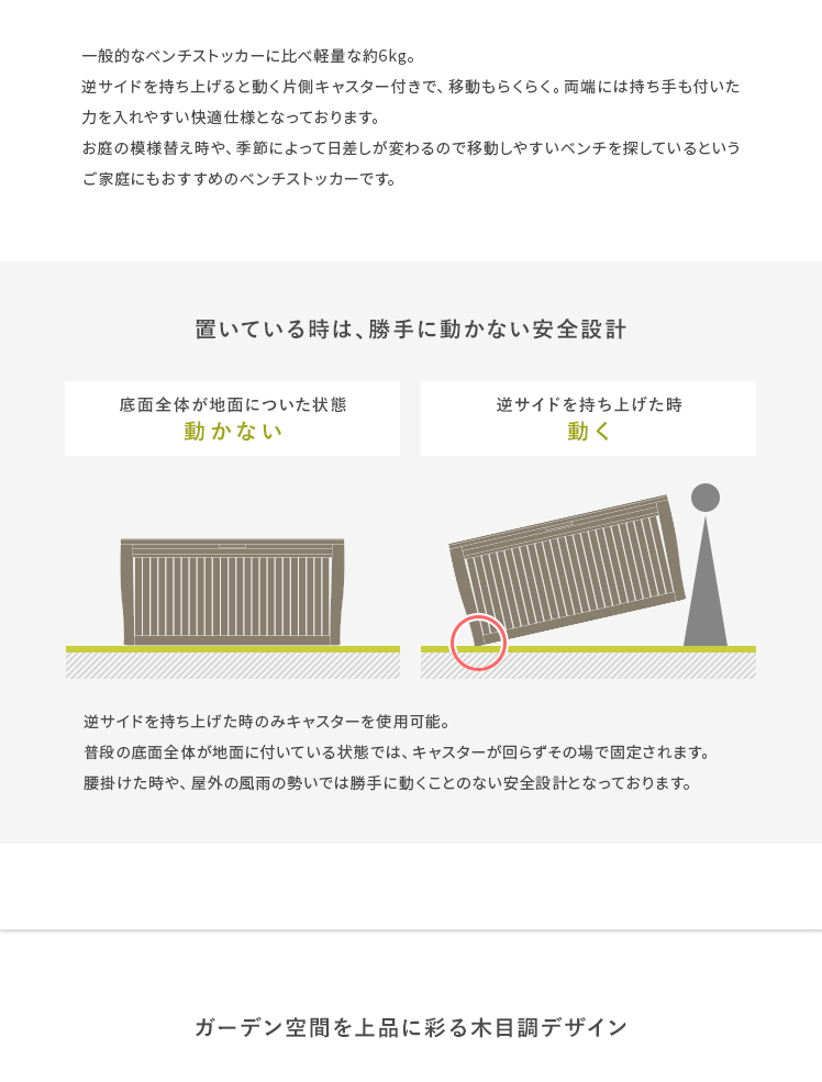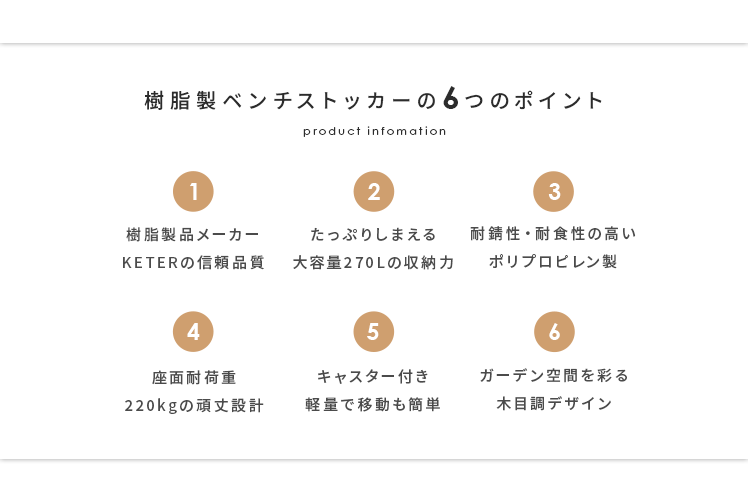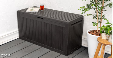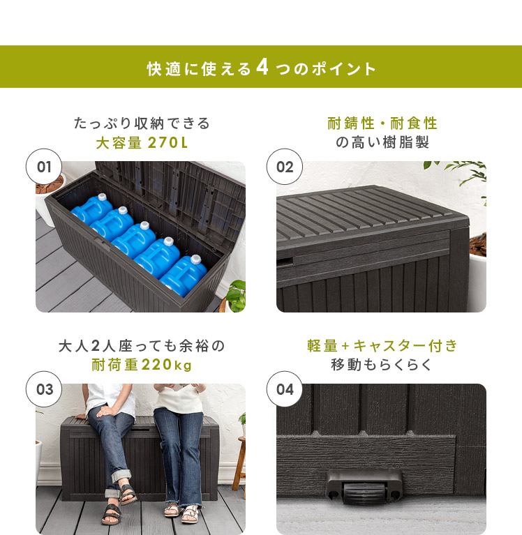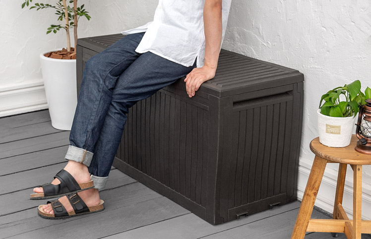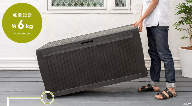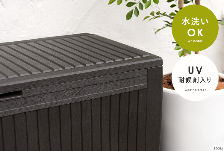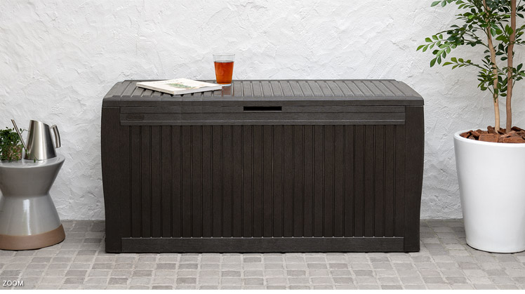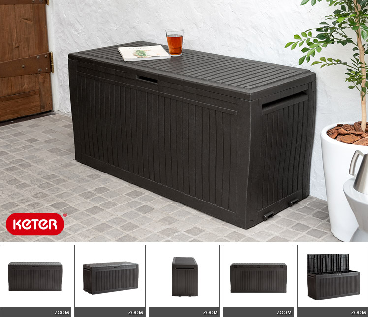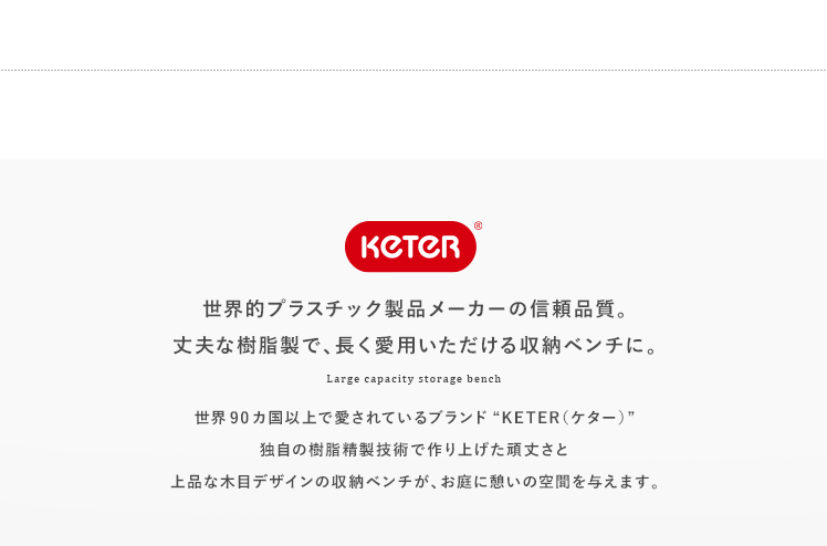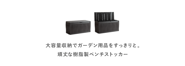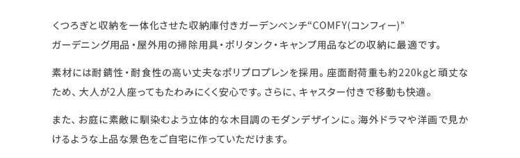 KETER〔ケター〕 ガーデンベンチ COMFY〔コンフィー〕/くつろぎと収納を一体化させた収納庫付きガーデンベンチ“COMFY(コンフィー)”ガーデニング用品・屋外用の掃除用具・ポリタンク・キャンプ用品などの収納に最適です。素材には耐錆性・耐食性の高い丈夫なポリプロプレンを採用。座面耐荷重も約220kgと頑丈なため、大人が2人座ってもたわみにくく安心です。さらに、キャスター付きで移動も快適。また、お庭に素敵に馴染むよう立体的な木目調のモダンデザインに。海外ドラマや洋画で見かけるような上品な景色をご自宅に作っていただけます。収納を兼ね備えた一台二役のベンチで、ご自宅のお庭やベランダを見栄え良く、優雅なひとときを。