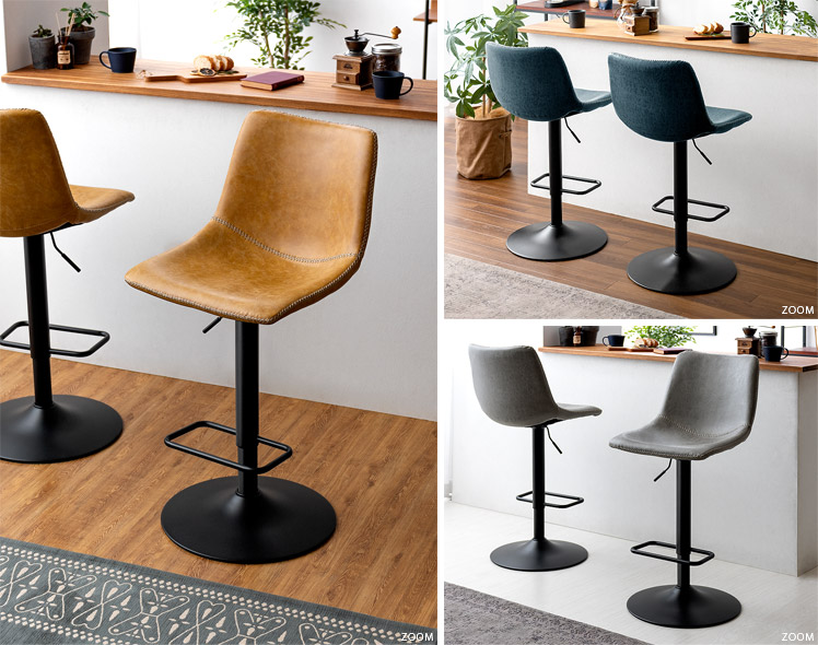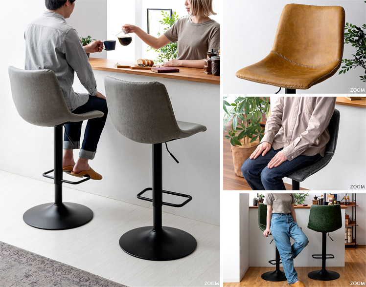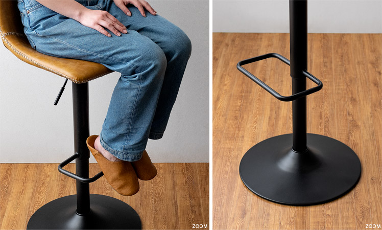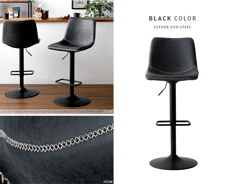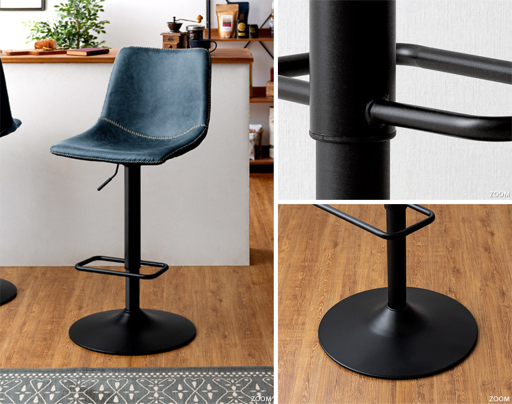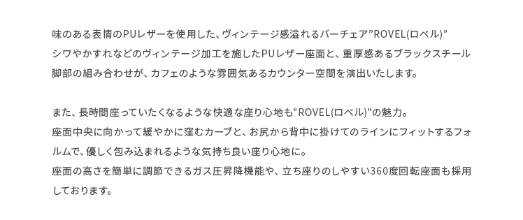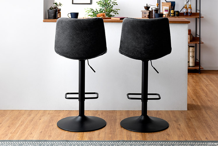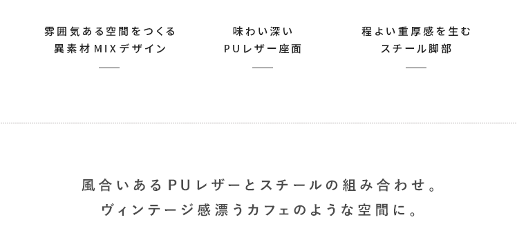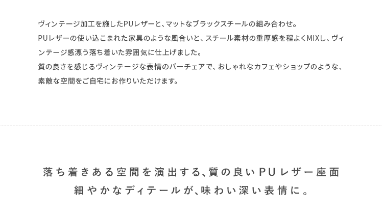 ヴィンテージ加工を施したPUレザー座面と、重厚感あるブラックスチール脚部の組み合わせが、カフェのような雰囲気あるカウンター空間を演出いたします。