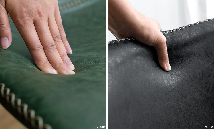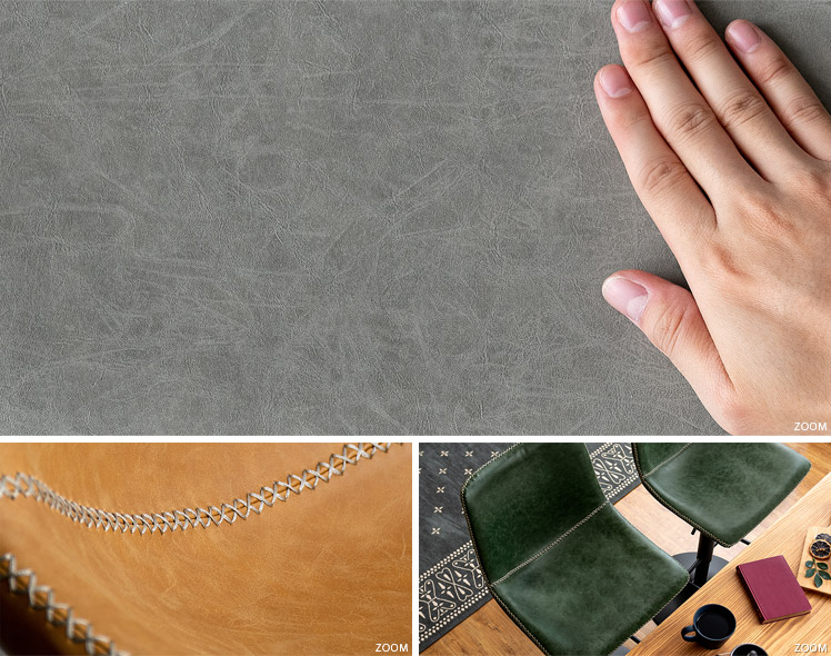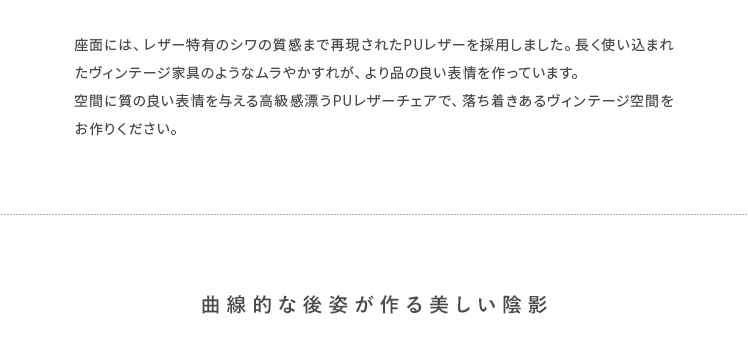 座面には、レザー特有のシワの質感まで再現されたPUレザーを採用。長く使い込まれたヴィンテージ家具のようなムラやかすれが、より品の良い表情を作っています