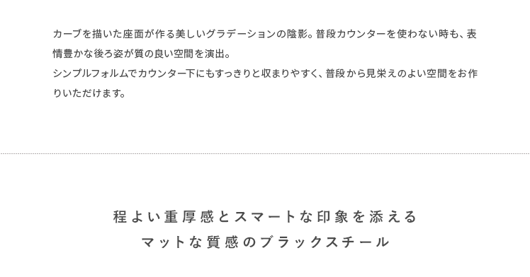 カーブを描いた座面が作る美しいグラデーションの陰影。普段カウンターを使わない時も、表情豊かな後ろ姿が質の良い空間を演出。