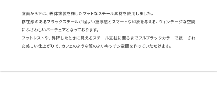 存在感のあるブラックスチールが程よい重厚感とスマートな印象を与える、ヴィンテージな空間にふさわしいバーチェアとなっております。