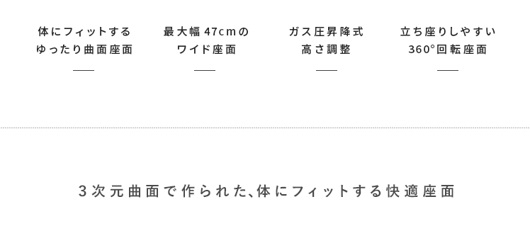 体に沿うように作られた3次元曲面のフォルムが、お尻や腰に優しくフィット。
