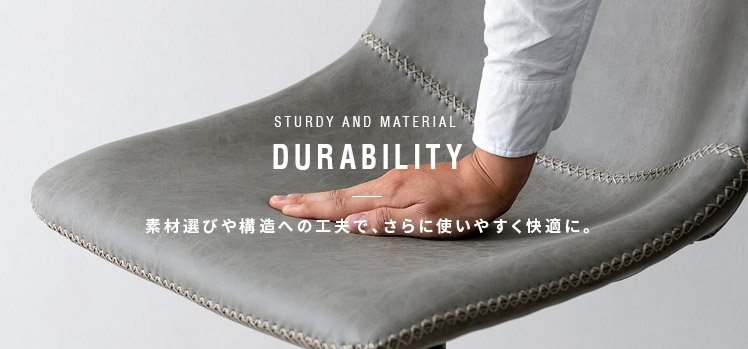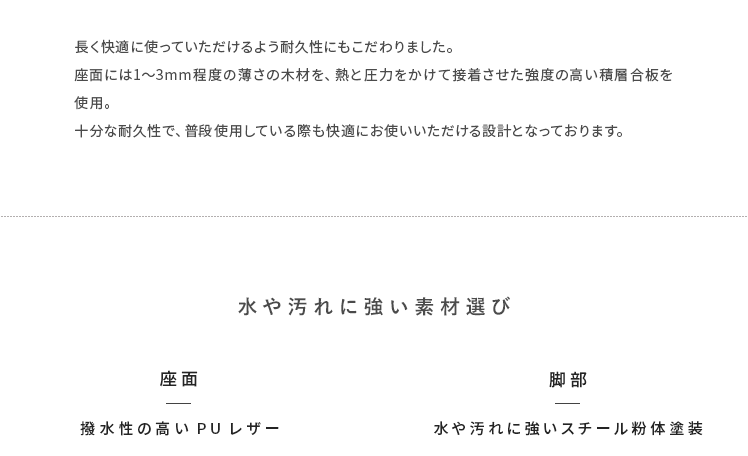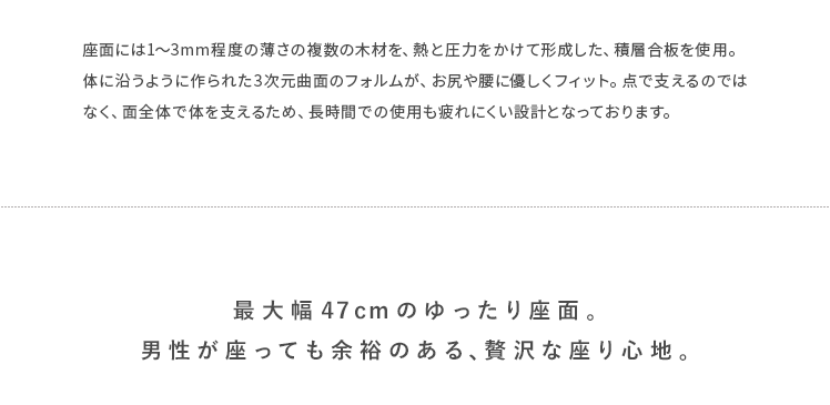 座面には1〜3mm程度の薄さの木材を、熱と圧力をかけて接着させた強度の高い積層合板を使用。十分な耐久性で、快適にお使いいただける設計となっております。