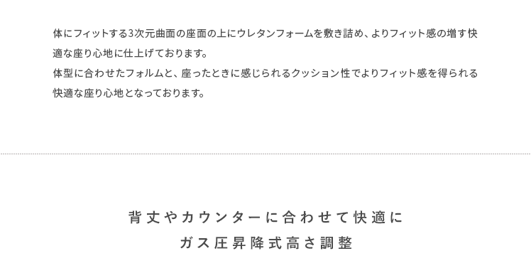 体型に合わせたフォルムと、座ったときに感じられるクッション性でよりフィット感を得られる快適な座り心地となっております。