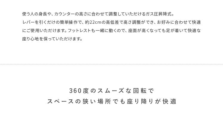 使う人の身長や、カウンターの高さに合わせて調整していただけるガス圧昇降式。レバーを引くだけの簡単操作で、約22cmの高低差で高さ調整していただけます。