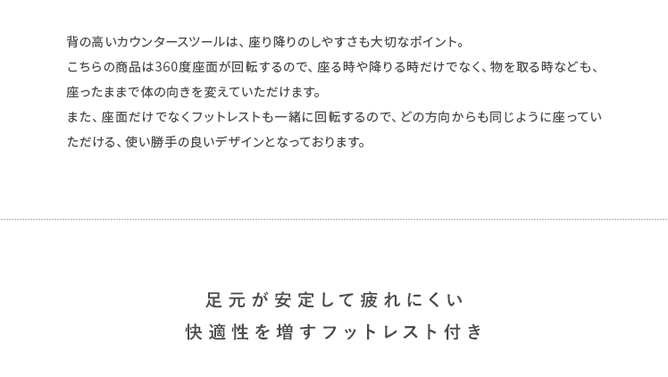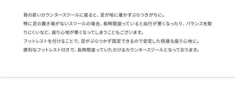 便利なフットレスト付きで、長時間座っていただけるカウンタースツールとなっております。