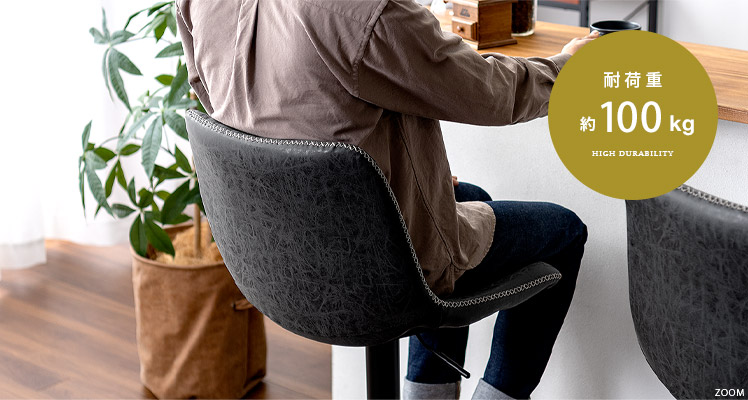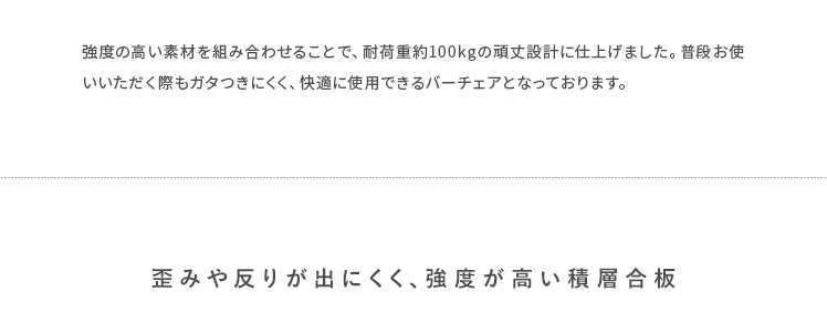 強度の高い素材を組み合わせることで、耐荷重約100kgの頑丈設計に。普段お使いいただく際もガタつきにくく、快適に使用できるバーチェアとなっております。