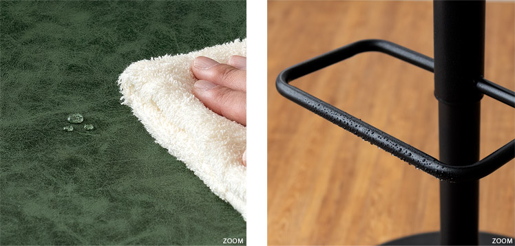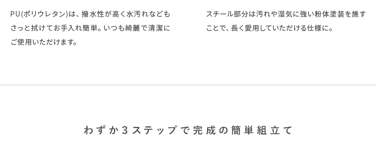 PU(ポリウレタン)は、撥水性が高く水汚れなどもさっと拭けてお手入れ簡単。いつも綺麗で清潔にご使用いただけます。