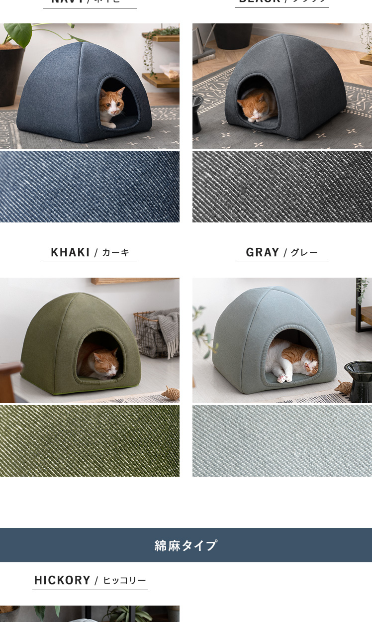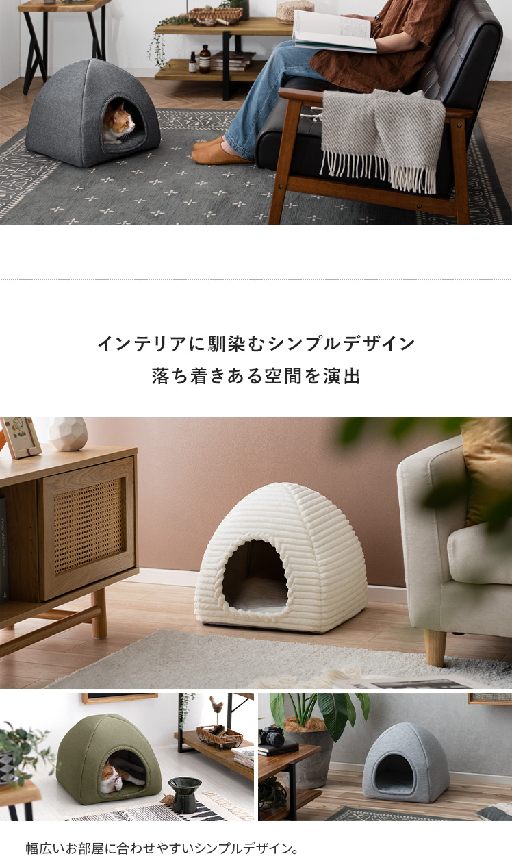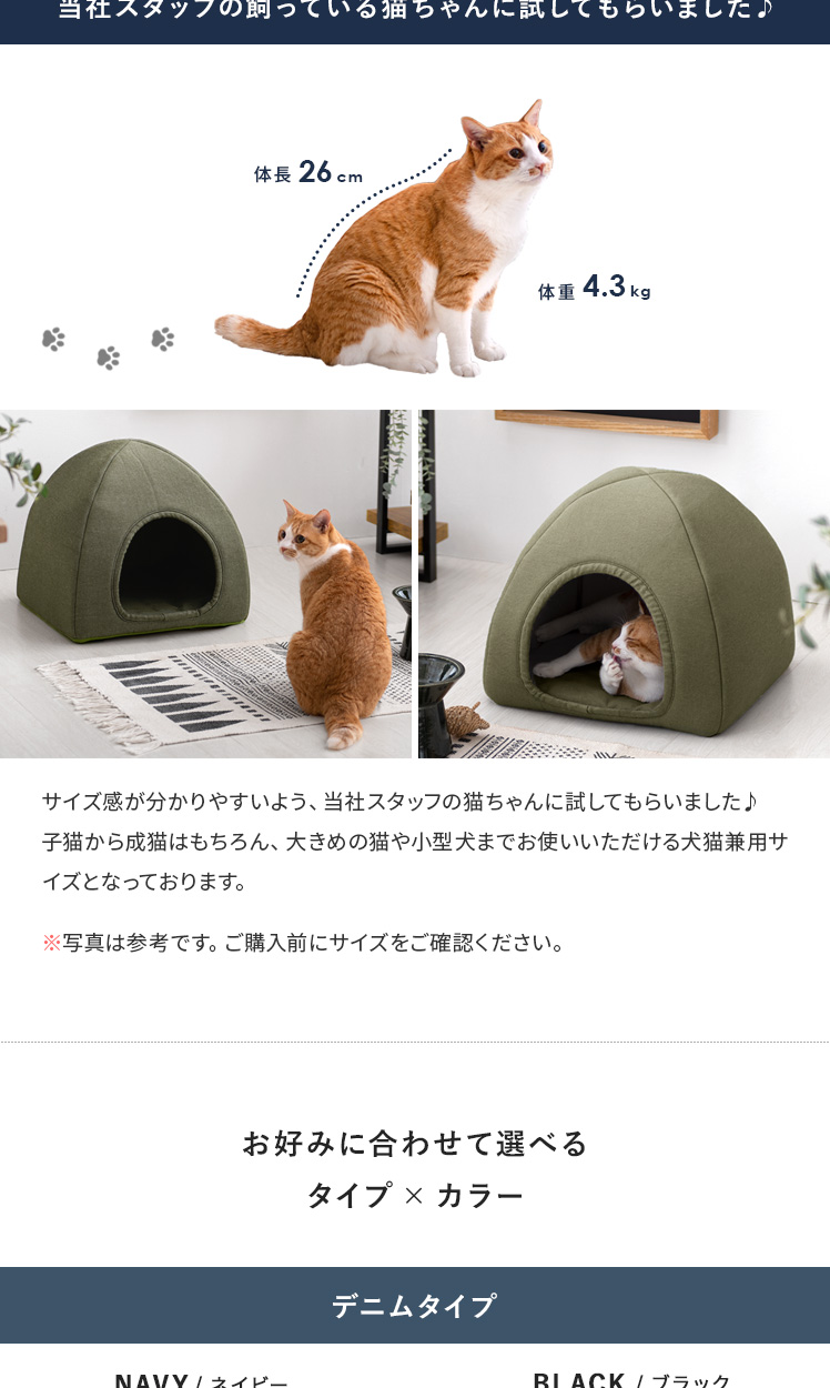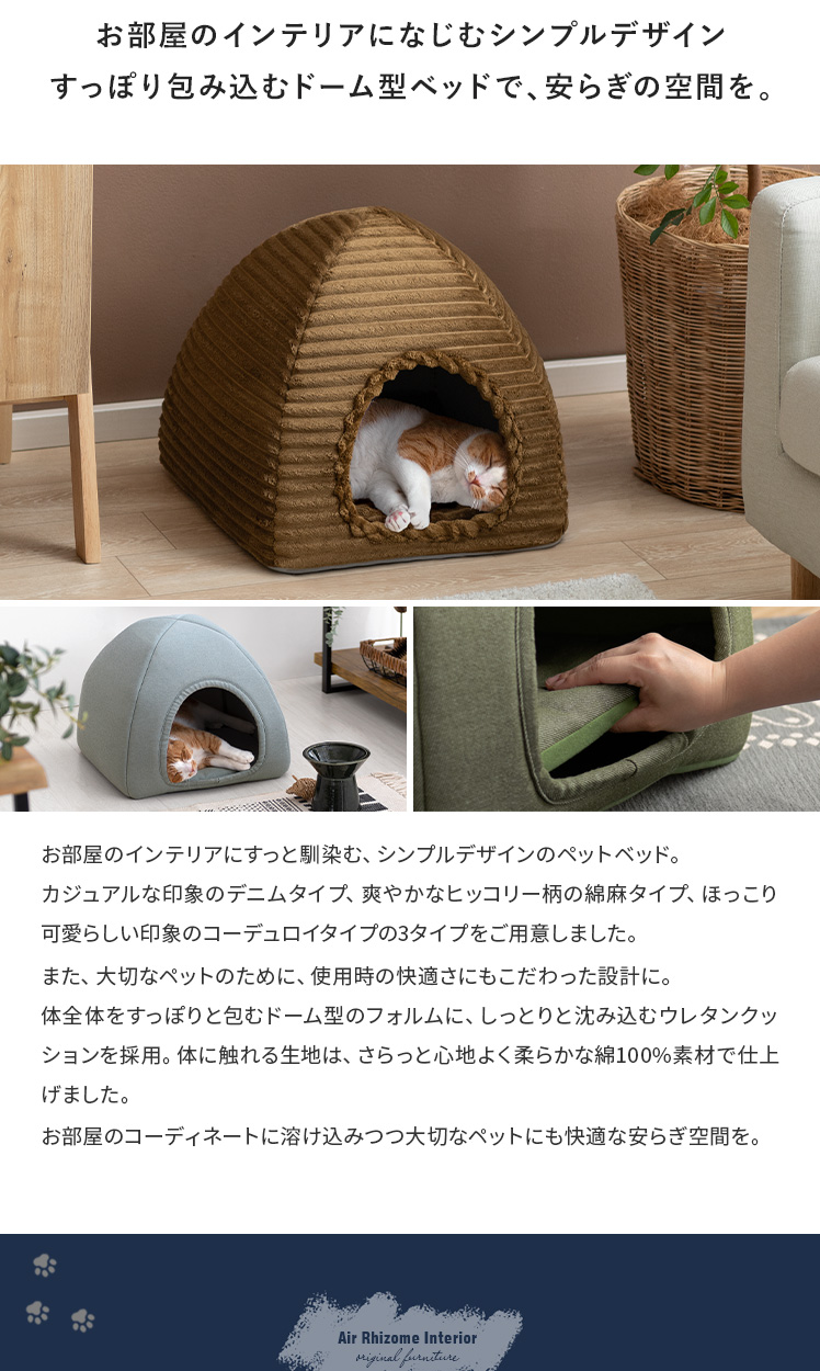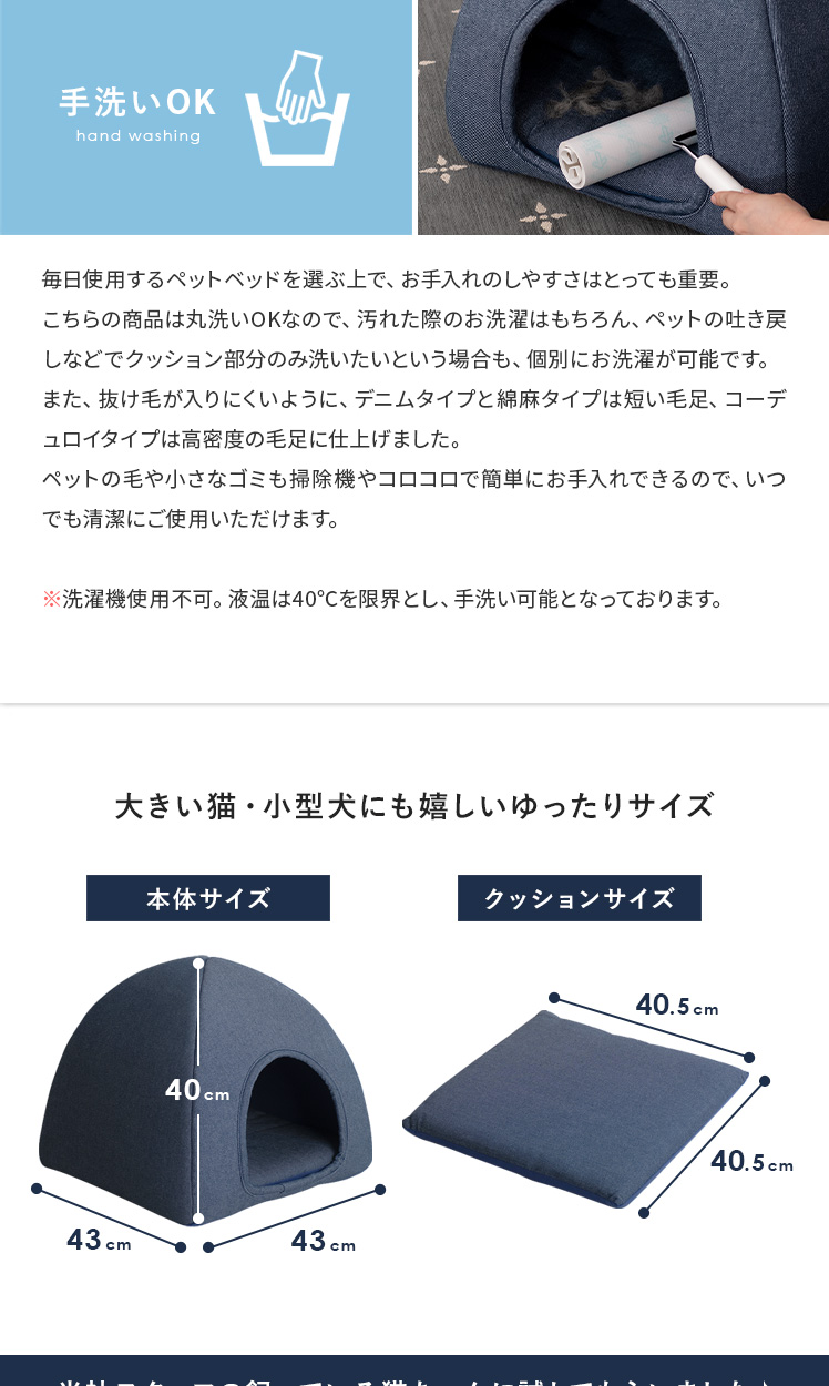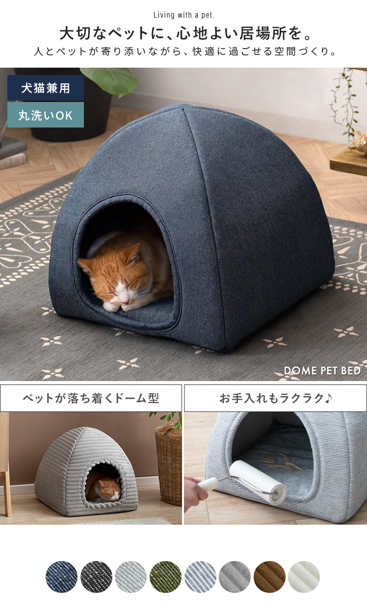 犬・猫兼用デニムデザイン ペットベッド〔ドーム型〕 /お部屋のインテリアにすっと馴染む、デニムデザイン生地のペットベッド。ノンウォッシュデニムの落ち着いた風合いは、色々なコーディネートに合わせやすく、雰囲気ある空間づくりをしていただけます。また、大切なペットのために、使用時の快適さにもこだわりました。体全体をすっぽりと包むドーム型のフォルムに、しっとりと沈み込むウレタンクッションを採用。体に触れる生地は、さらっと心地よく柔らかな綿100%素材で仕上げました。お部屋のコーディネートに溶け込みつつ、大切なペットにも快適な安らぎ空間を。