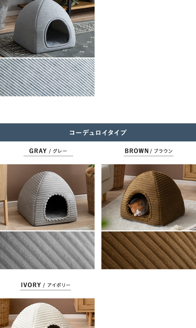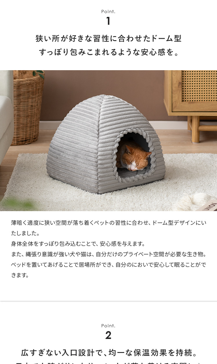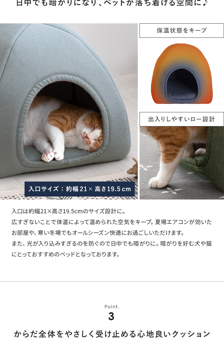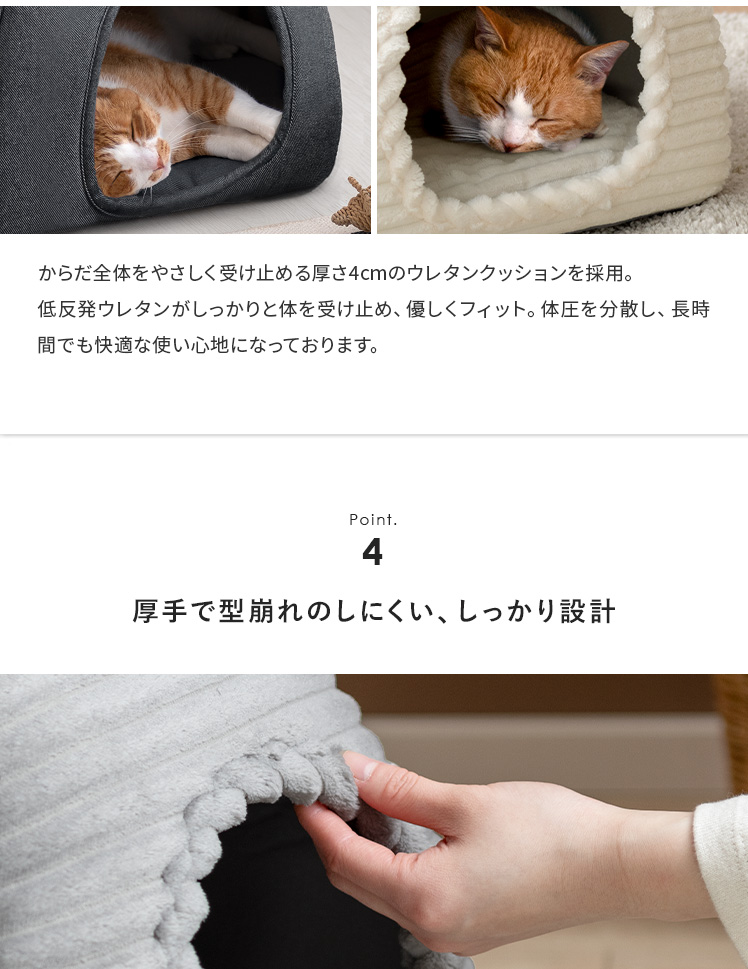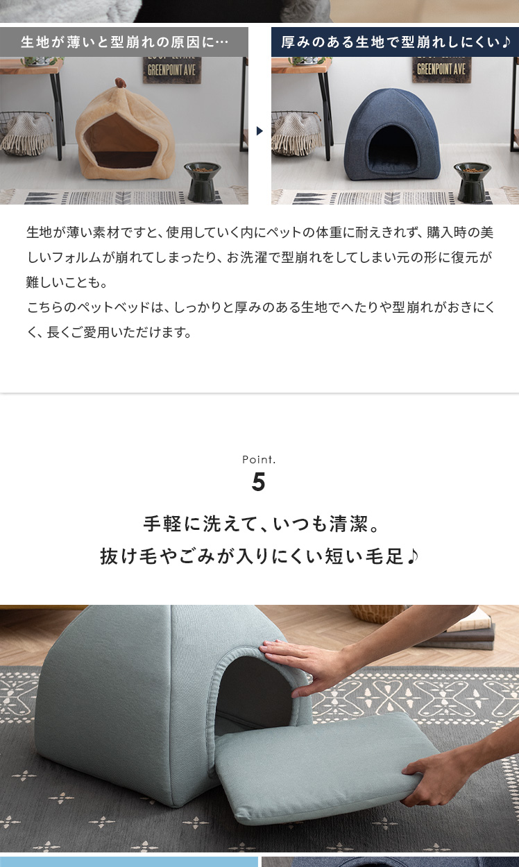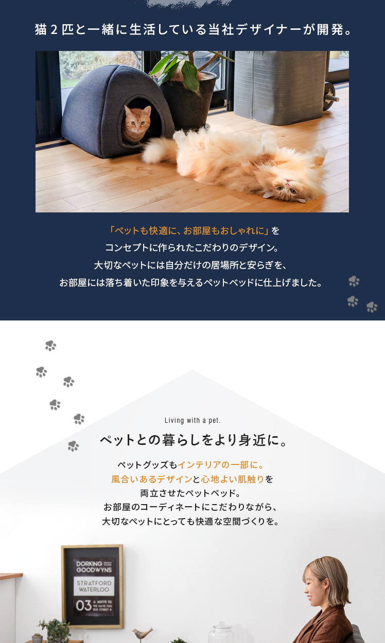 犬・猫兼用デニムデザイン ペットベッド〔ドーム型〕 /お部屋のインテリアにすっと馴染む、デニムデザイン生地のペットベッド。ノンウォッシュデニムの落ち着いた風合いは、色々なコーディネートに合わせやすく、雰囲気ある空間づくりをしていただけます。また、大切なペットのために、使用時の快適さにもこだわりました。体全体をすっぽりと包むドーム型のフォルムに、しっとりと沈み込むウレタンクッションを採用。体に触れる生地は、さらっと心地よく柔らかな綿100%素材で仕上げました。お部屋のコーディネートに溶け込みつつ、大切なペットにも快適な安らぎ空間を。